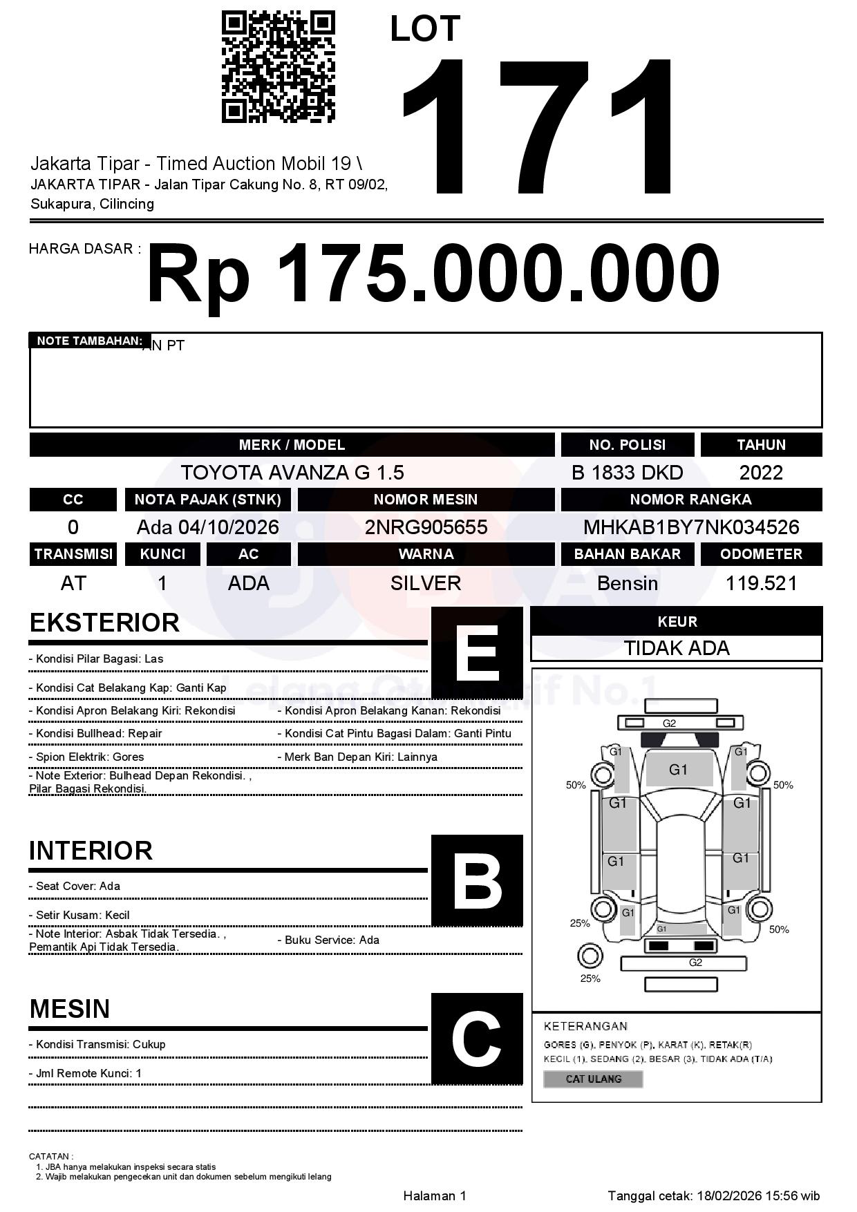 - Kondisi objek lelang dilelang apa adanya, baik kondisi fisik, mesin maupun legalitas kendaraan. Jika terdapat kekurangan/cacat baik yang terlihat maupun yang tidak terlihat, maka semua akan menjadi tanggung jawab/risiko Pemenang Lelang. Oleh karena itu, Pemenang Lelang melepaskan segala hak untuk menuntut dan/atau meminta ganti rugi atas hal tersebut kepada JBA.