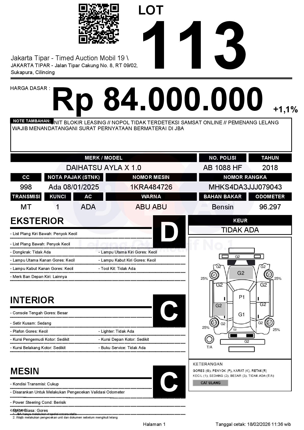 - Kondisi objek lelang dilelang apa adanya, baik kondisi fisik, mesin maupun legalitas kendaraan. Jika terdapat kekurangan/cacat baik yang terlihat maupun yang tidak terlihat, maka semua akan menjadi tanggung jawab/risiko Pemenang Lelang. Oleh karena itu, Pemenang Lelang melepaskan segala hak untuk menuntut dan/atau meminta ganti rugi atas hal tersebut kepada JBA.