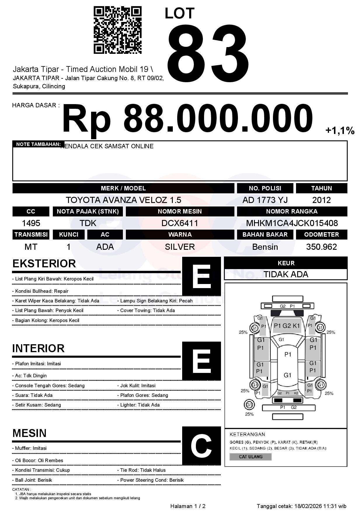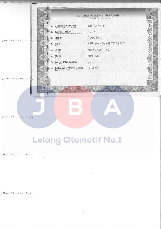 - Kondisi objek lelang dilelang apa adanya, baik kondisi fisik, mesin maupun legalitas kendaraan. Jika terdapat kekurangan/cacat baik yang terlihat maupun yang tidak terlihat, maka semua akan menjadi tanggung jawab/risiko Pemenang Lelang. Oleh karena itu, Pemenang Lelang melepaskan segala hak untuk menuntut dan/atau meminta ganti rugi atas hal tersebut kepada JBA.