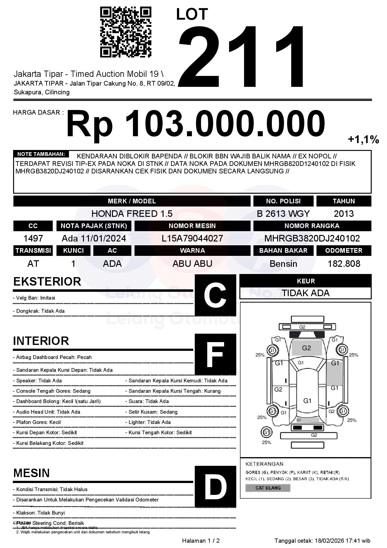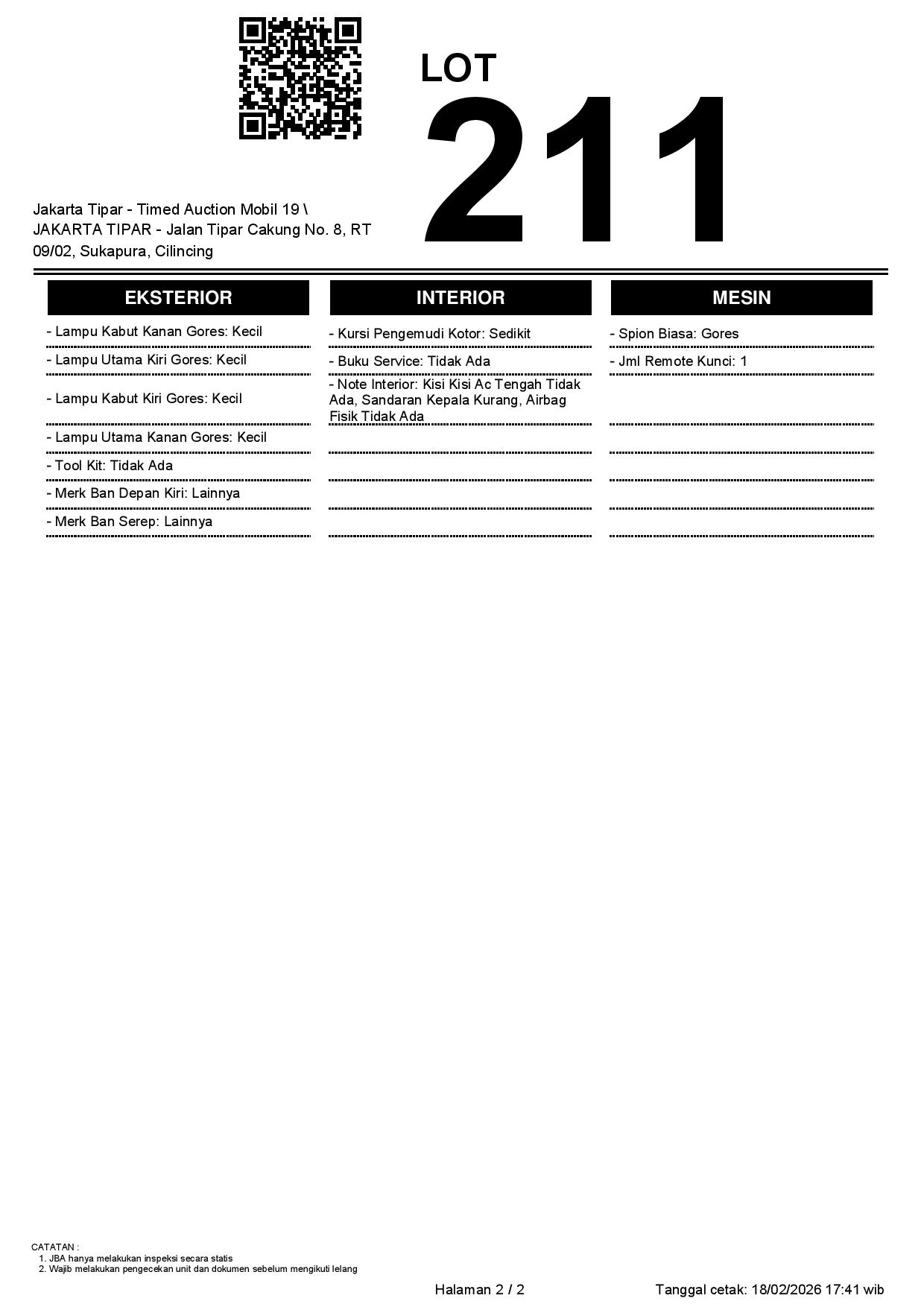 - Kondisi objek lelang dilelang apa adanya, baik kondisi fisik, mesin maupun legalitas kendaraan. Jika terdapat kekurangan/cacat baik yang terlihat maupun yang tidak terlihat, maka semua akan menjadi tanggung jawab/risiko Pemenang Lelang. Oleh karena itu, Pemenang Lelang melepaskan segala hak untuk menuntut dan/atau meminta ganti rugi atas hal tersebut kepada JBA.