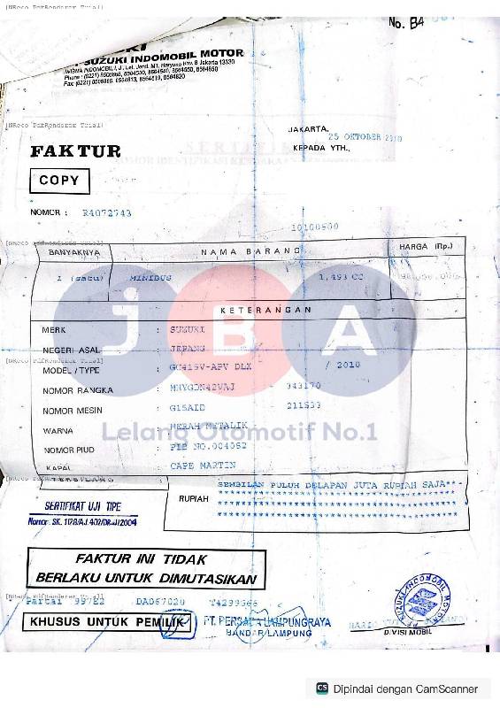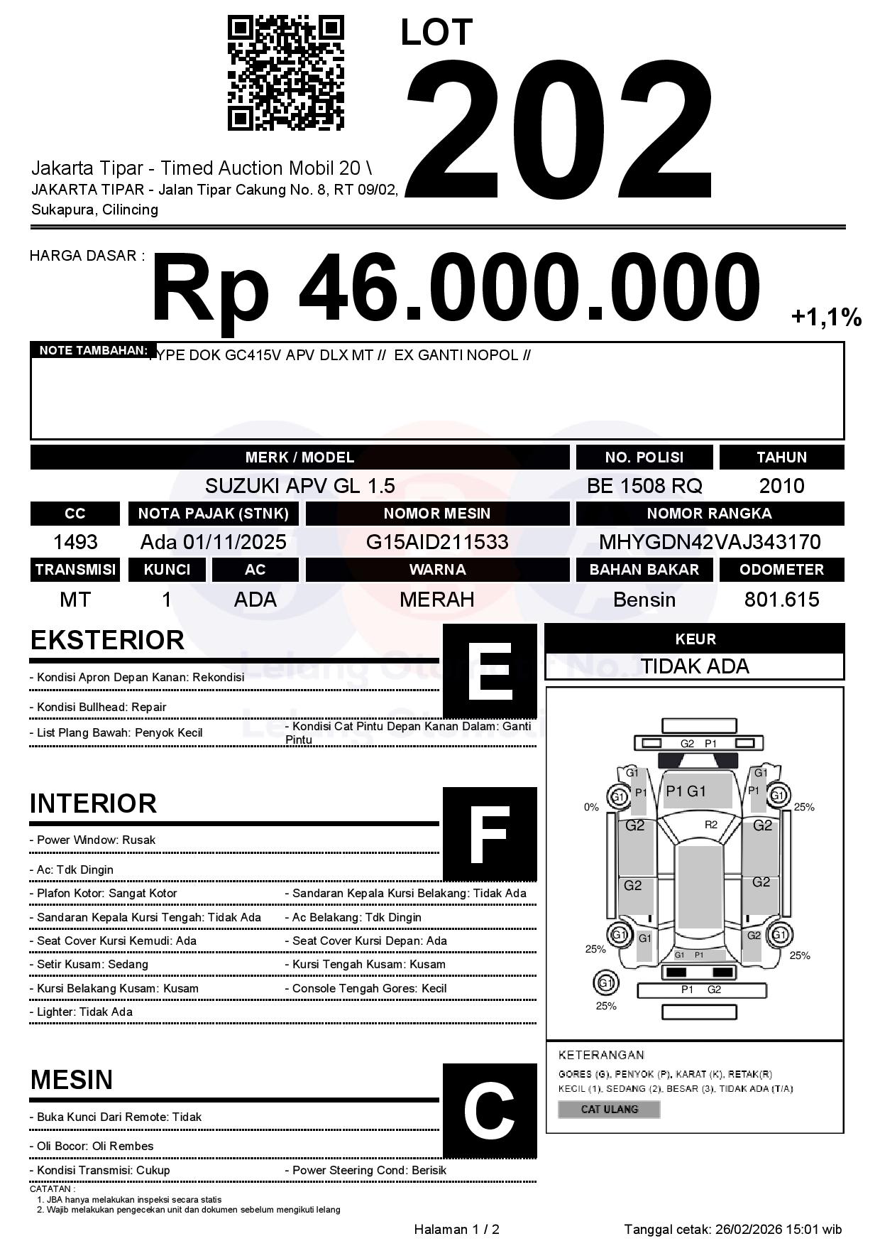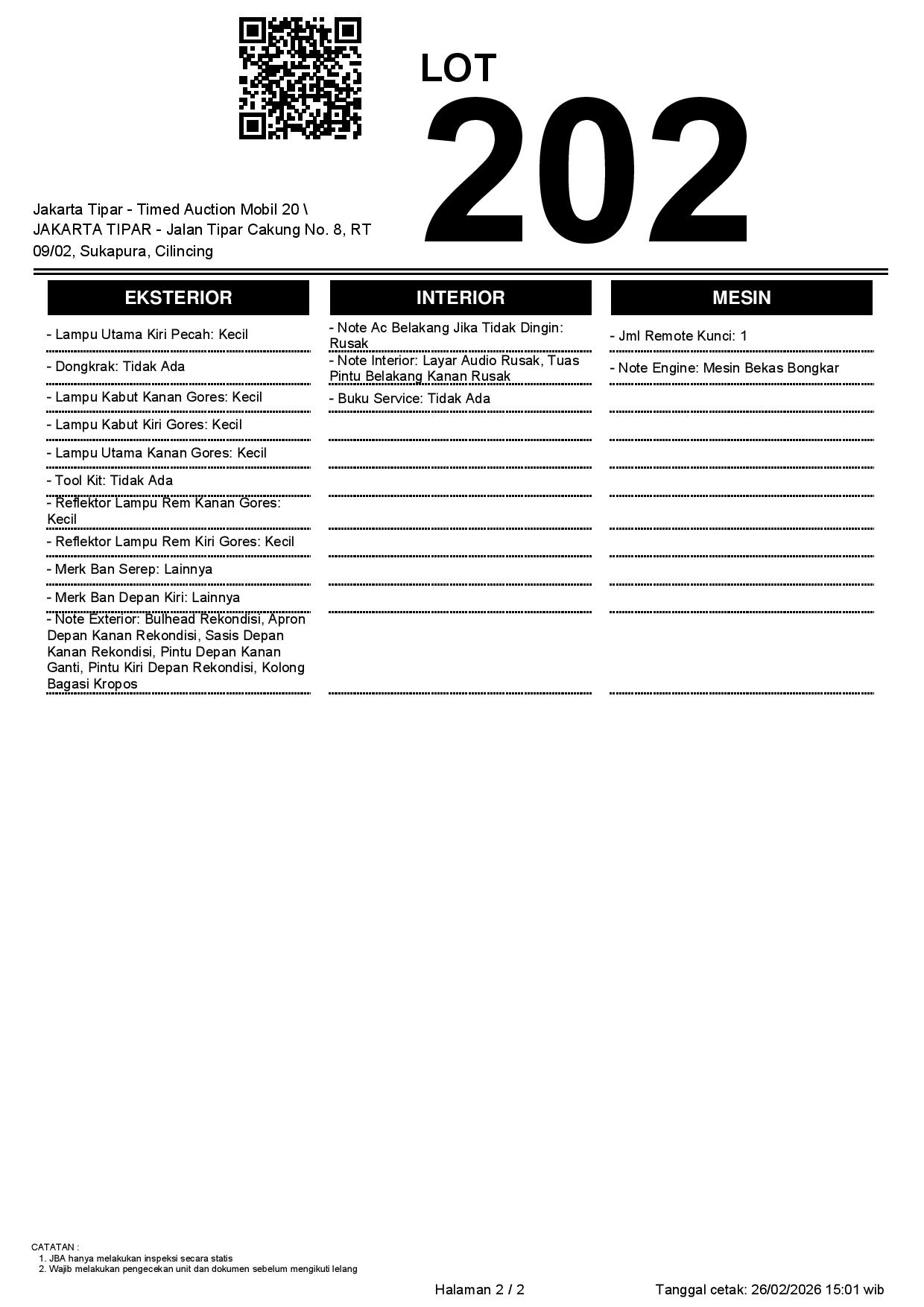 - Kondisi objek lelang dilelang apa adanya, baik kondisi fisik, mesin maupun legalitas kendaraan. Jika terdapat kekurangan/cacat baik yang terlihat maupun yang tidak terlihat, maka semua akan menjadi tanggung jawab/risiko Pemenang Lelang. Oleh karena itu, Pemenang Lelang melepaskan segala hak untuk menuntut dan/atau meminta ganti rugi atas hal tersebut kepada JBA.