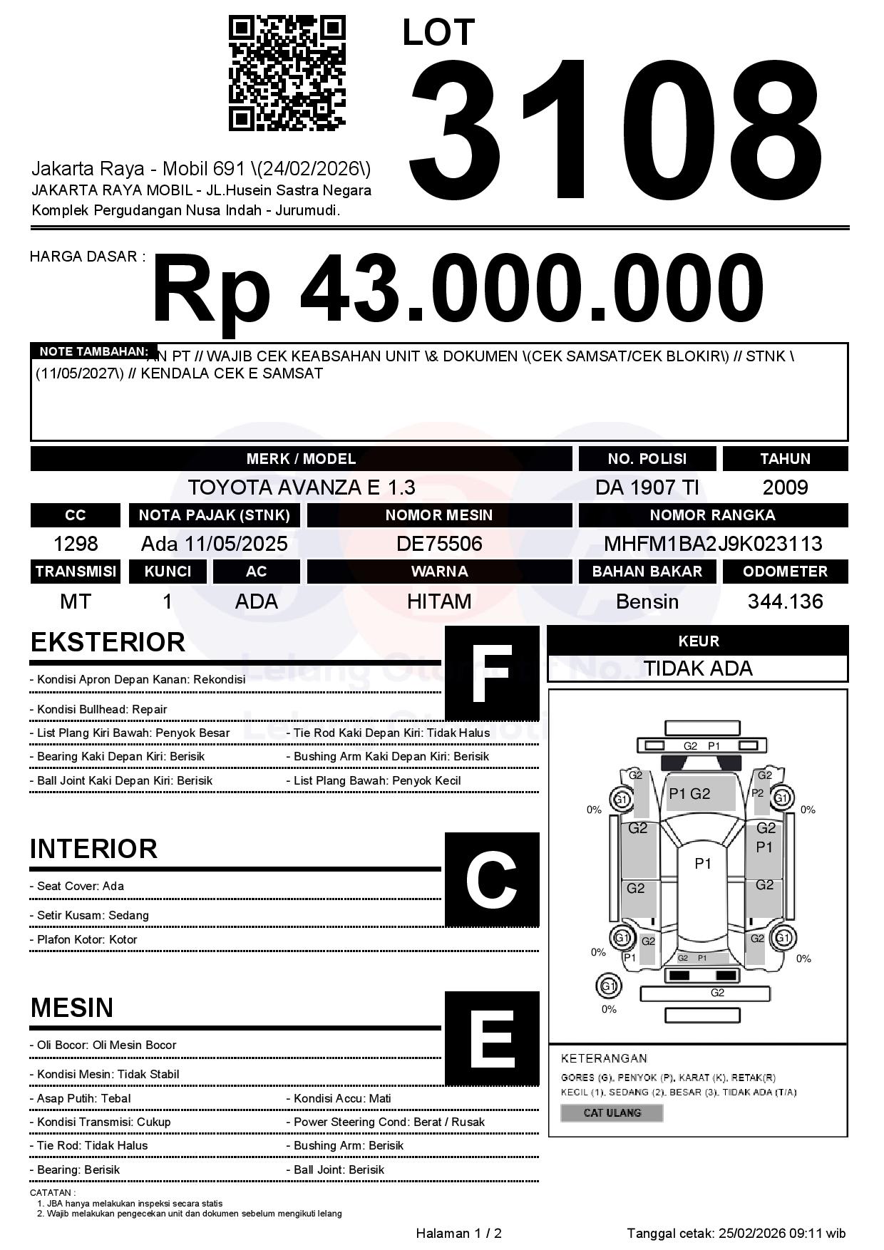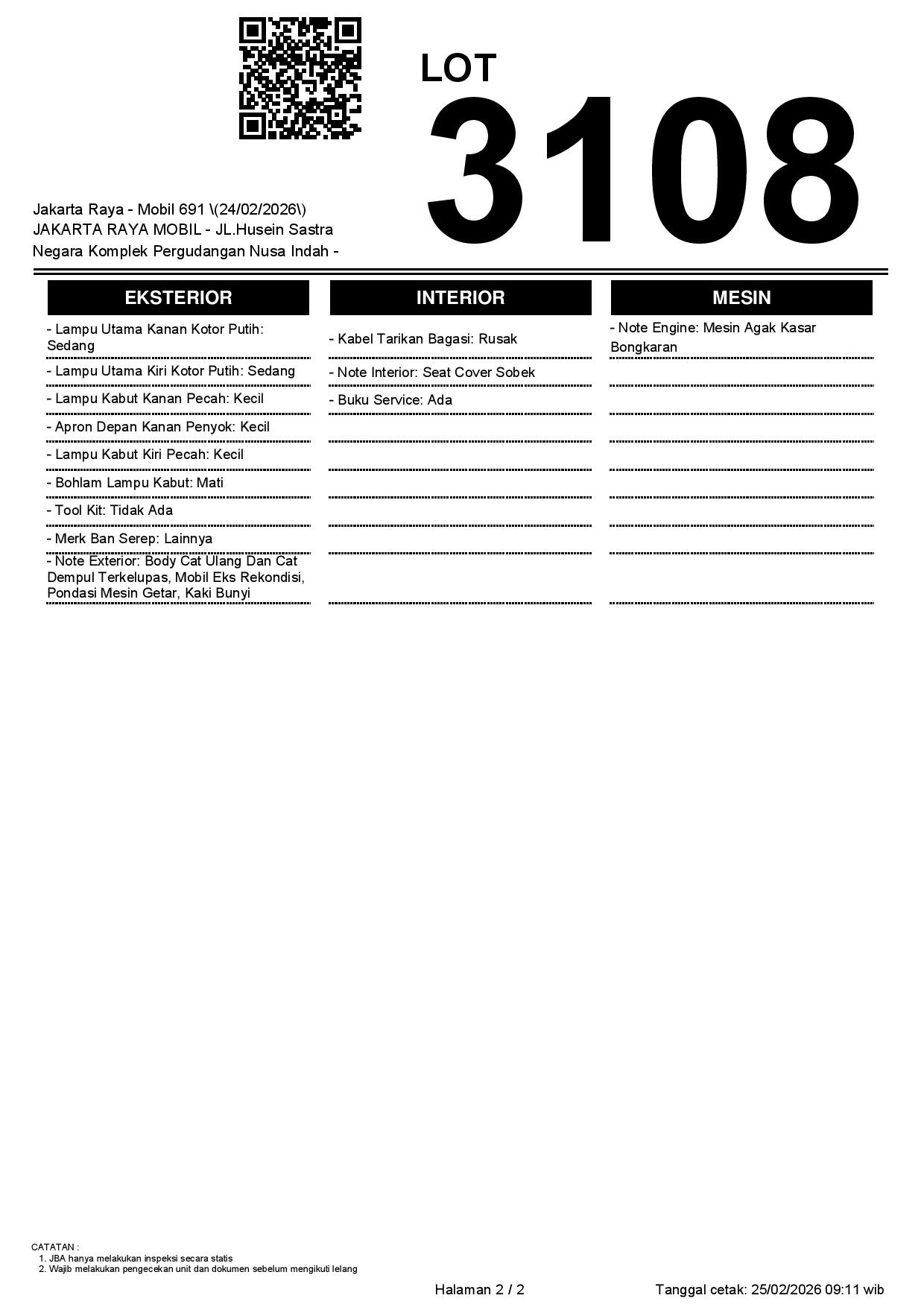 - Kondisi objek lelang dilelang apa adanya, baik kondisi fisik, mesin maupun legalitas kendaraan. Jika terdapat kekurangan/cacat baik yang terlihat maupun yang tidak terlihat, maka semua akan menjadi tanggung jawab/risiko Pemenang Lelang. Oleh karena itu, Pemenang Lelang melepaskan segala hak untuk menuntut dan/atau meminta ganti rugi atas hal tersebut kepada JBA.