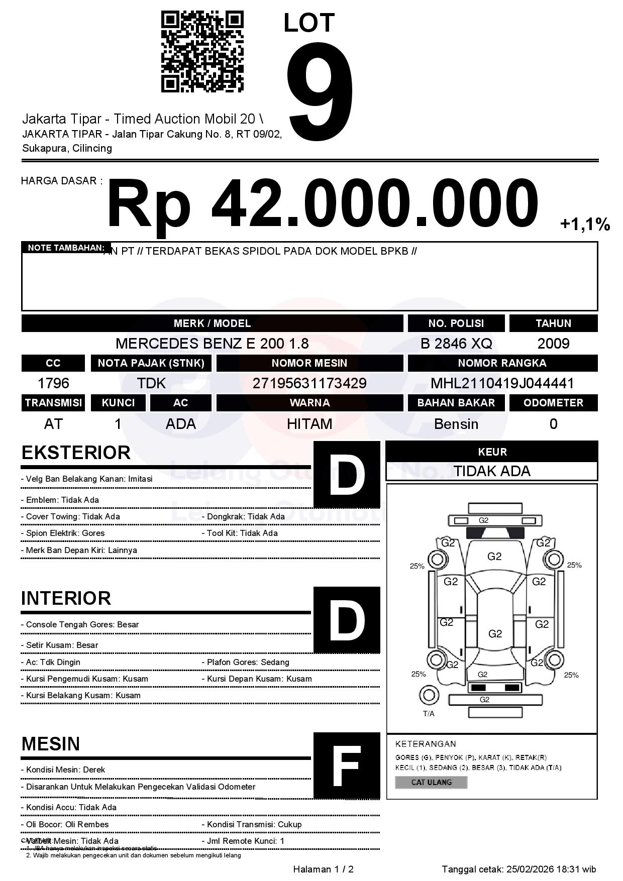 - Kondisi objek lelang dilelang apa adanya, baik kondisi fisik, mesin maupun legalitas kendaraan. Jika terdapat kekurangan/cacat baik yang terlihat maupun yang tidak terlihat, maka semua akan menjadi tanggung jawab/risiko Pemenang Lelang. Oleh karena itu, Pemenang Lelang melepaskan segala hak untuk menuntut dan/atau meminta ganti rugi atas hal tersebut kepada JBA.