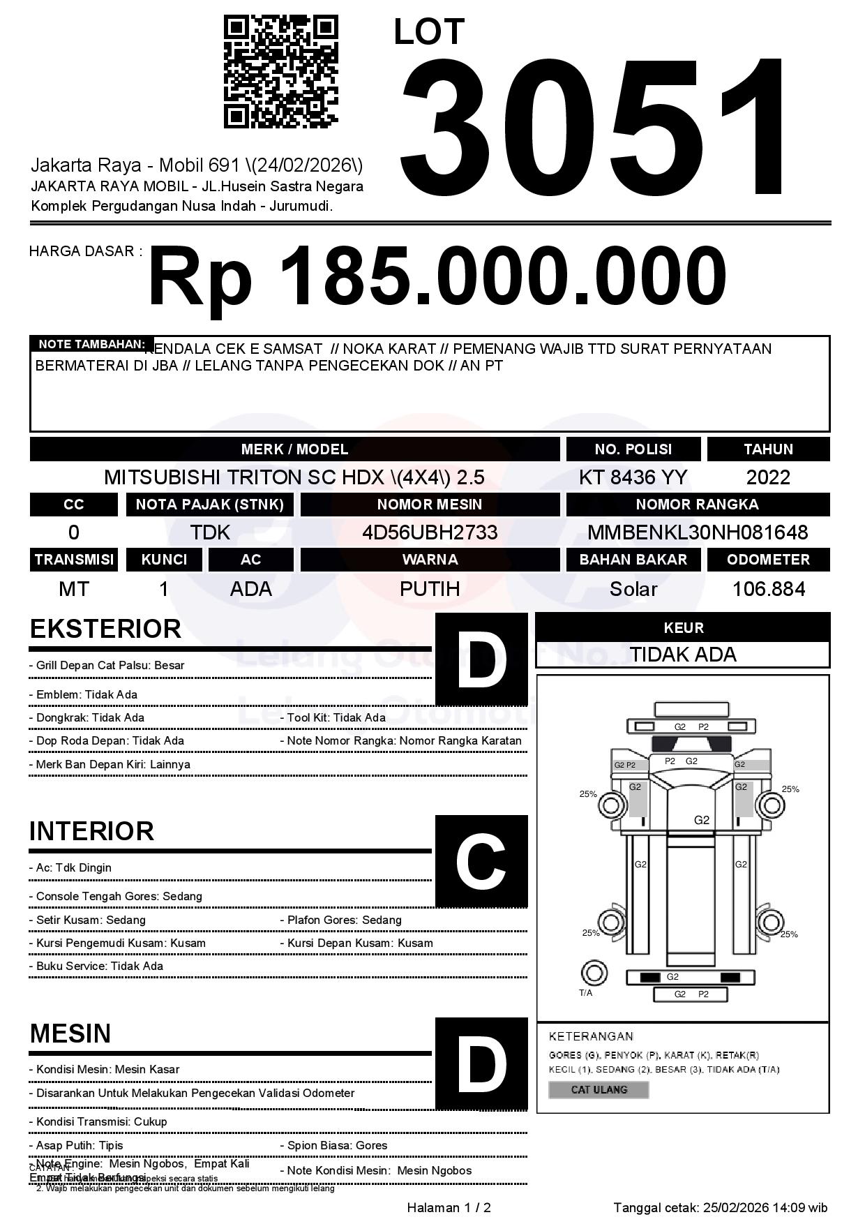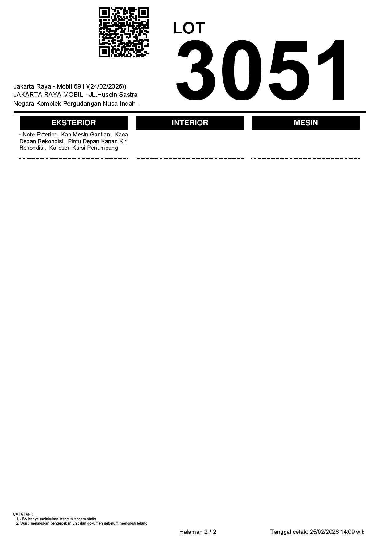 - Kondisi objek lelang dilelang apa adanya, baik kondisi fisik, mesin maupun legalitas kendaraan. Jika terdapat kekurangan/cacat baik yang terlihat maupun yang tidak terlihat, maka semua akan menjadi tanggung jawab/risiko Pemenang Lelang. Oleh karena itu, Pemenang Lelang melepaskan segala hak untuk menuntut dan/atau meminta ganti rugi atas hal tersebut kepada JBA.