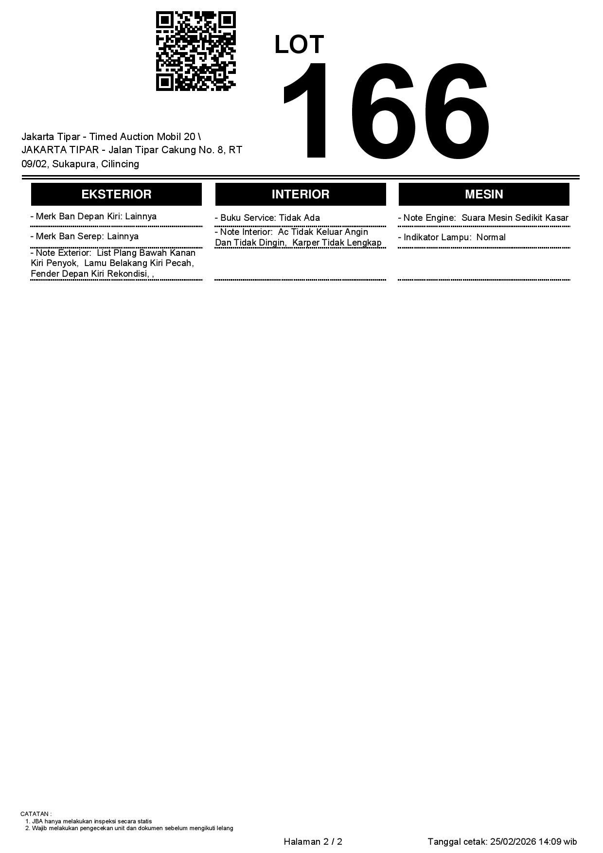- Kondisi objek lelang dilelang apa adanya, baik kondisi fisik, mesin maupun legalitas kendaraan. Jika terdapat kekurangan/cacat baik yang terlihat maupun yang tidak terlihat, maka semua akan menjadi tanggung jawab/risiko Pemenang Lelang. Oleh karena itu, Pemenang Lelang melepaskan segala hak untuk menuntut dan/atau meminta ganti rugi atas hal tersebut kepada JBA.
