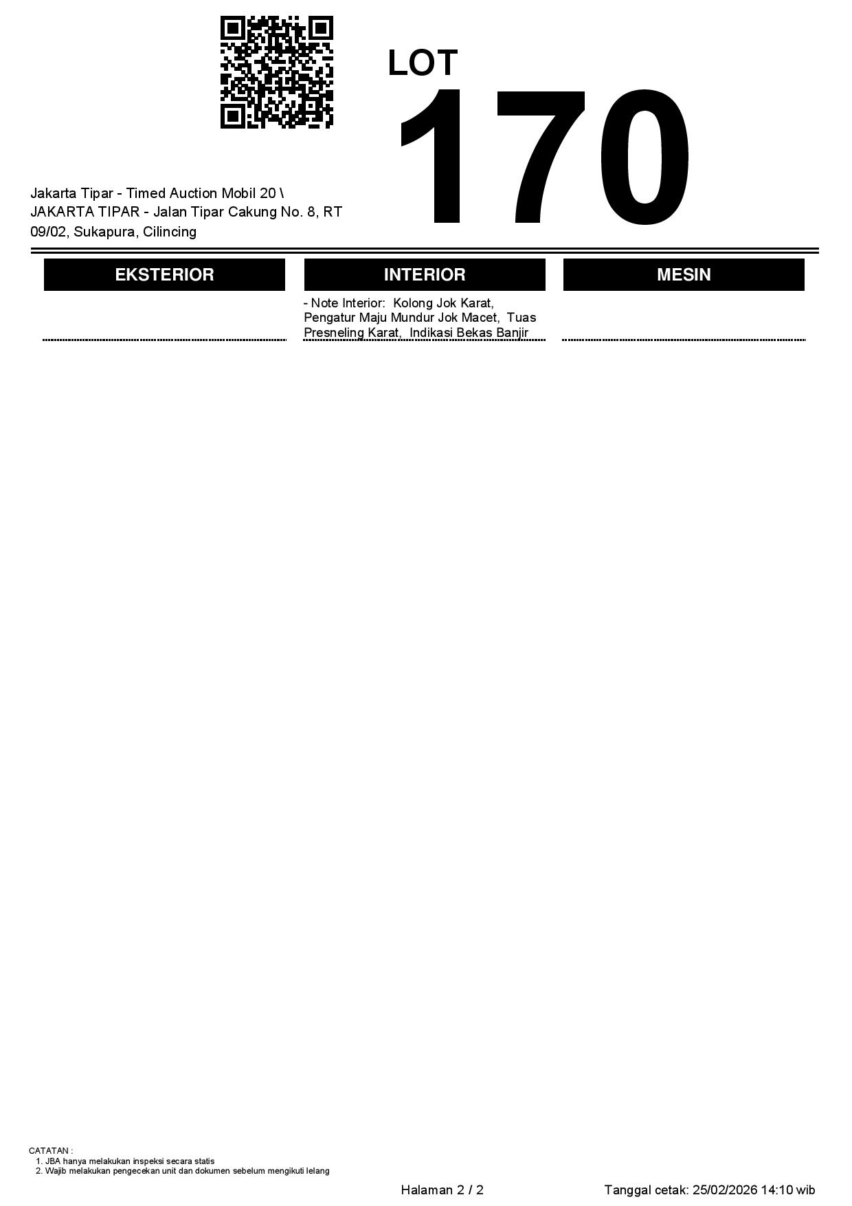 - Kondisi objek lelang dilelang apa adanya, baik kondisi fisik, mesin maupun legalitas kendaraan. Jika terdapat kekurangan/cacat baik yang terlihat maupun yang tidak terlihat, maka semua akan menjadi tanggung jawab/risiko Pemenang Lelang. Oleh karena itu, Pemenang Lelang melepaskan segala hak untuk menuntut dan/atau meminta ganti rugi atas hal tersebut kepada JBA.
