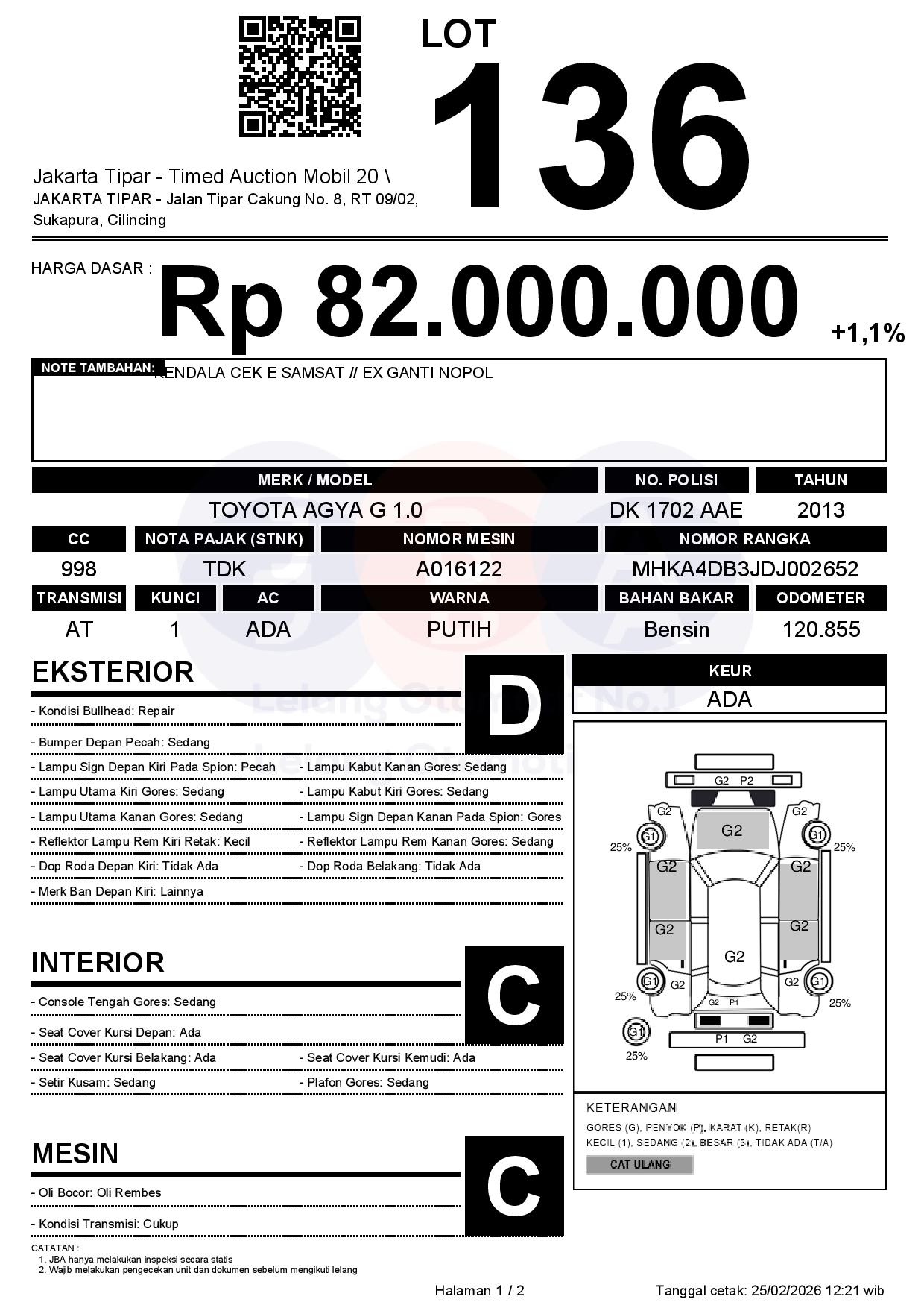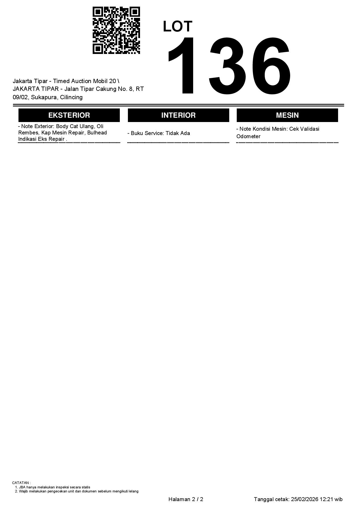 - Kondisi objek lelang dilelang apa adanya, baik kondisi fisik, mesin maupun legalitas kendaraan. Jika terdapat kekurangan/cacat baik yang terlihat maupun yang tidak terlihat, maka semua akan menjadi tanggung jawab/risiko Pemenang Lelang. Oleh karena itu, Pemenang Lelang melepaskan segala hak untuk menuntut dan/atau meminta ganti rugi atas hal tersebut kepada JBA.