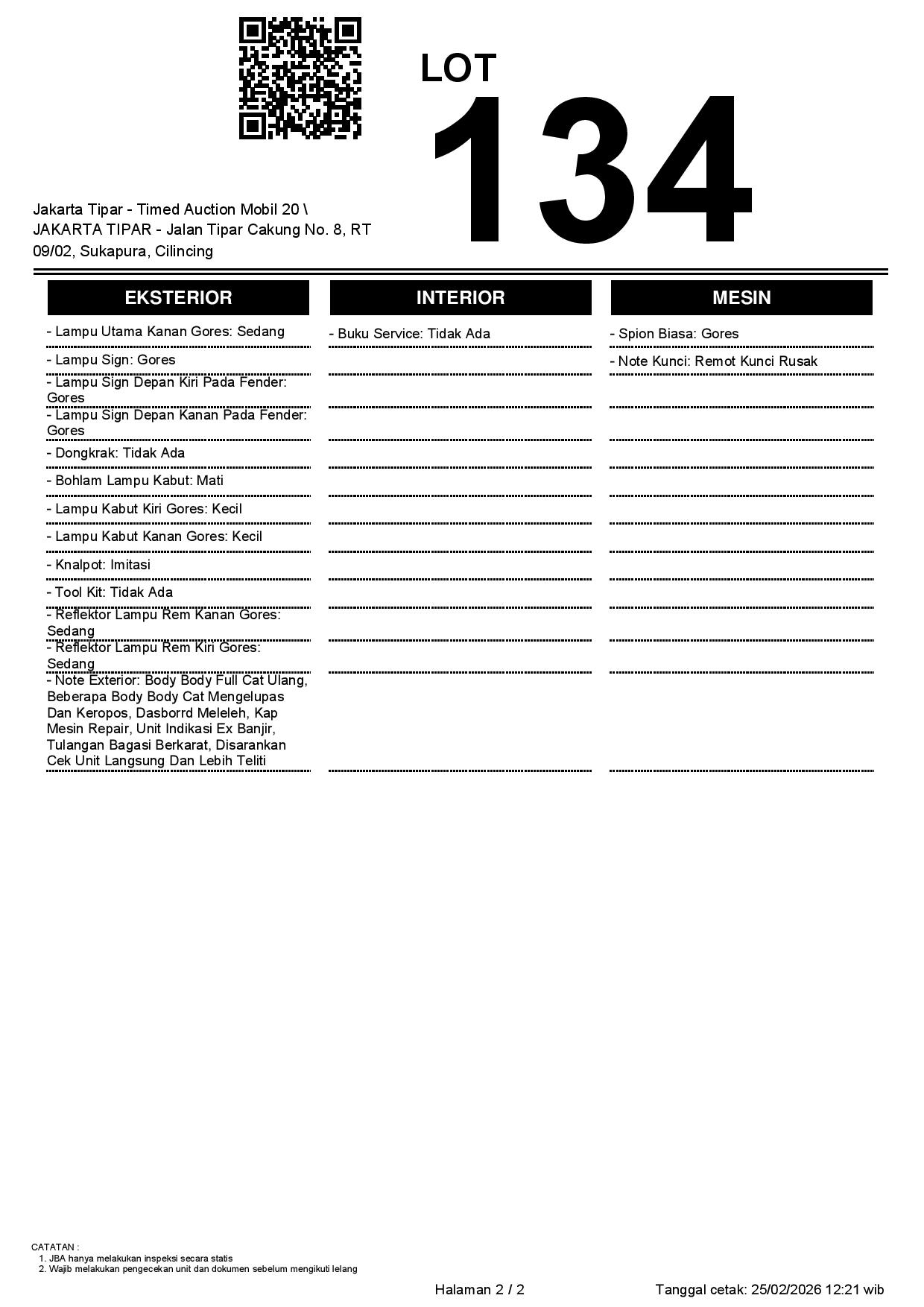 - Kondisi objek lelang dilelang apa adanya, baik kondisi fisik, mesin maupun legalitas kendaraan. Jika terdapat kekurangan/cacat baik yang terlihat maupun yang tidak terlihat, maka semua akan menjadi tanggung jawab/risiko Pemenang Lelang. Oleh karena itu, Pemenang Lelang melepaskan segala hak untuk menuntut dan/atau meminta ganti rugi atas hal tersebut kepada JBA.