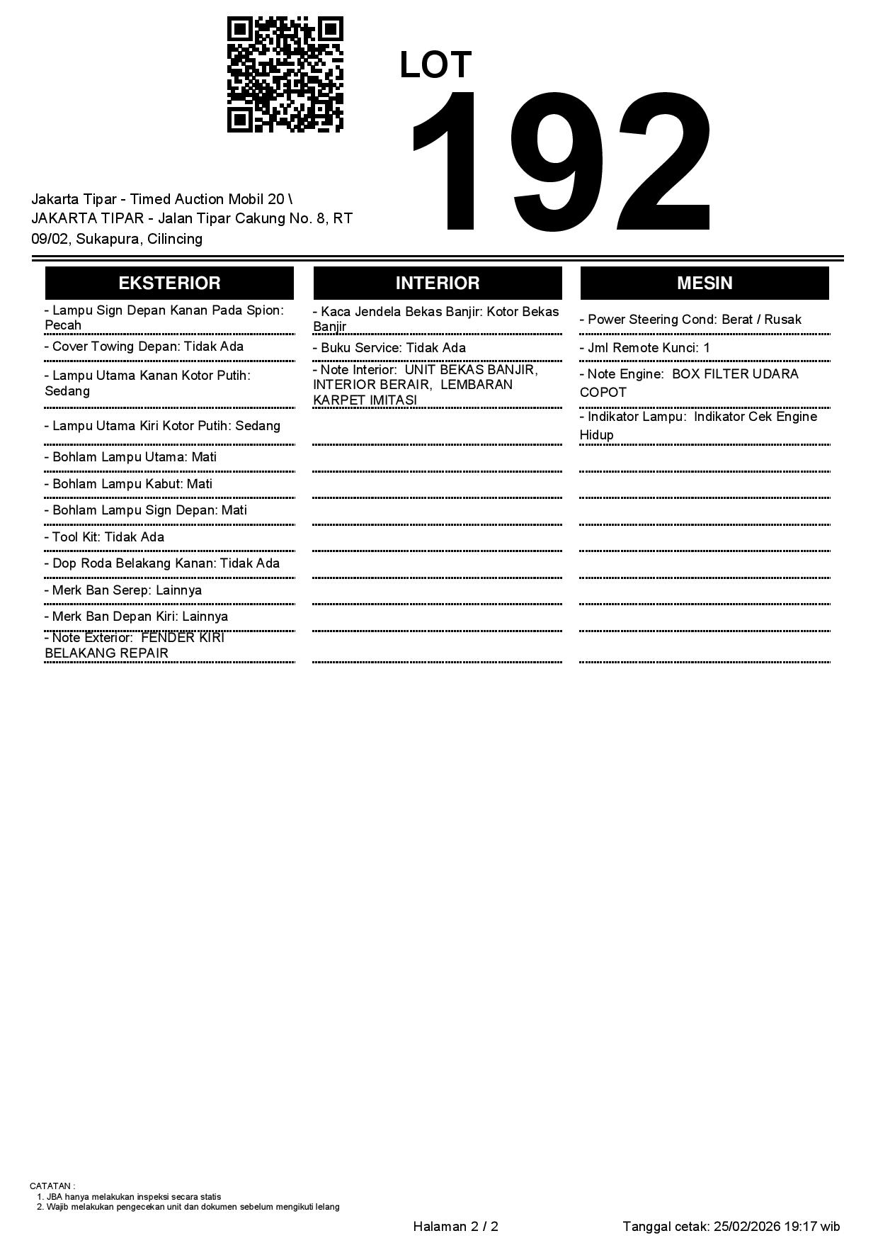- Kondisi objek lelang dilelang apa adanya, baik kondisi fisik, mesin maupun legalitas kendaraan. Jika terdapat kekurangan/cacat baik yang terlihat maupun yang tidak terlihat, maka semua akan menjadi tanggung jawab/risiko Pemenang Lelang. Oleh karena itu, Pemenang Lelang melepaskan segala hak untuk menuntut dan/atau meminta ganti rugi atas hal tersebut kepada JBA.