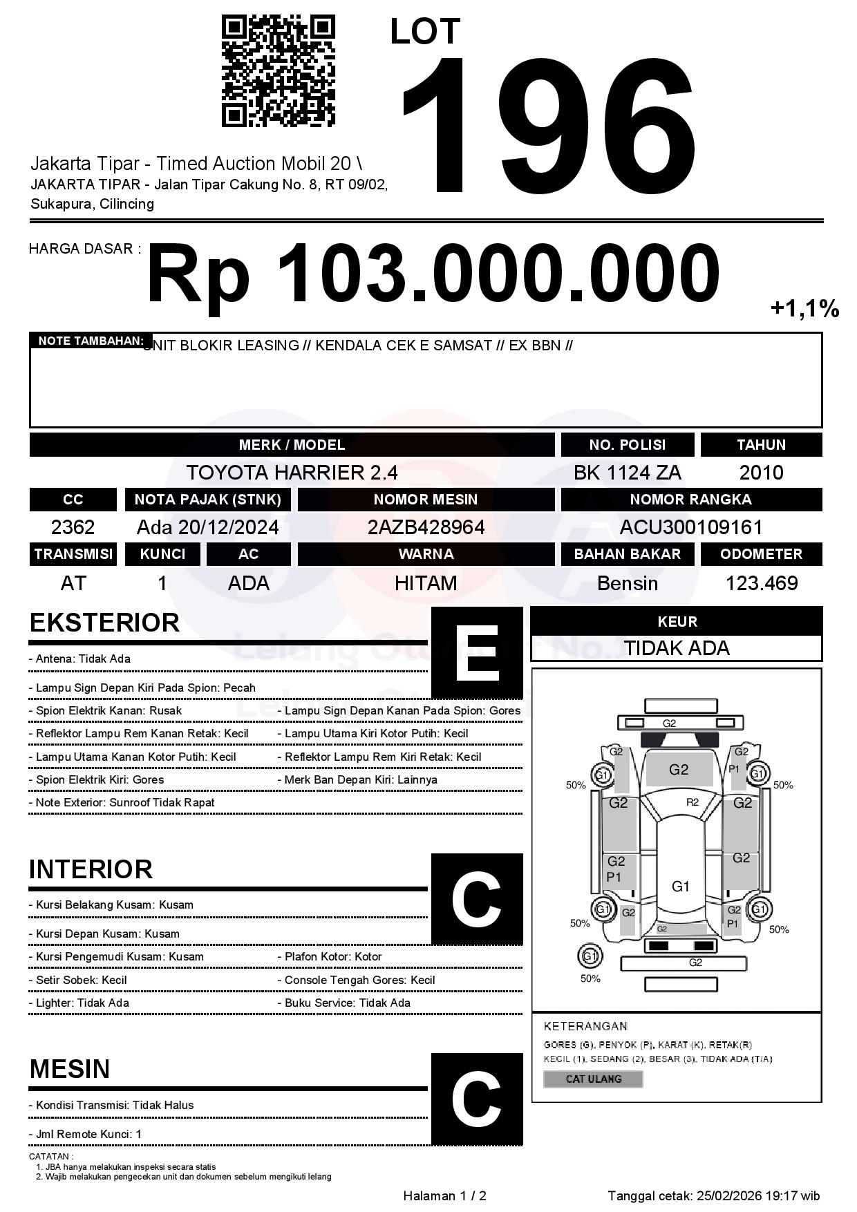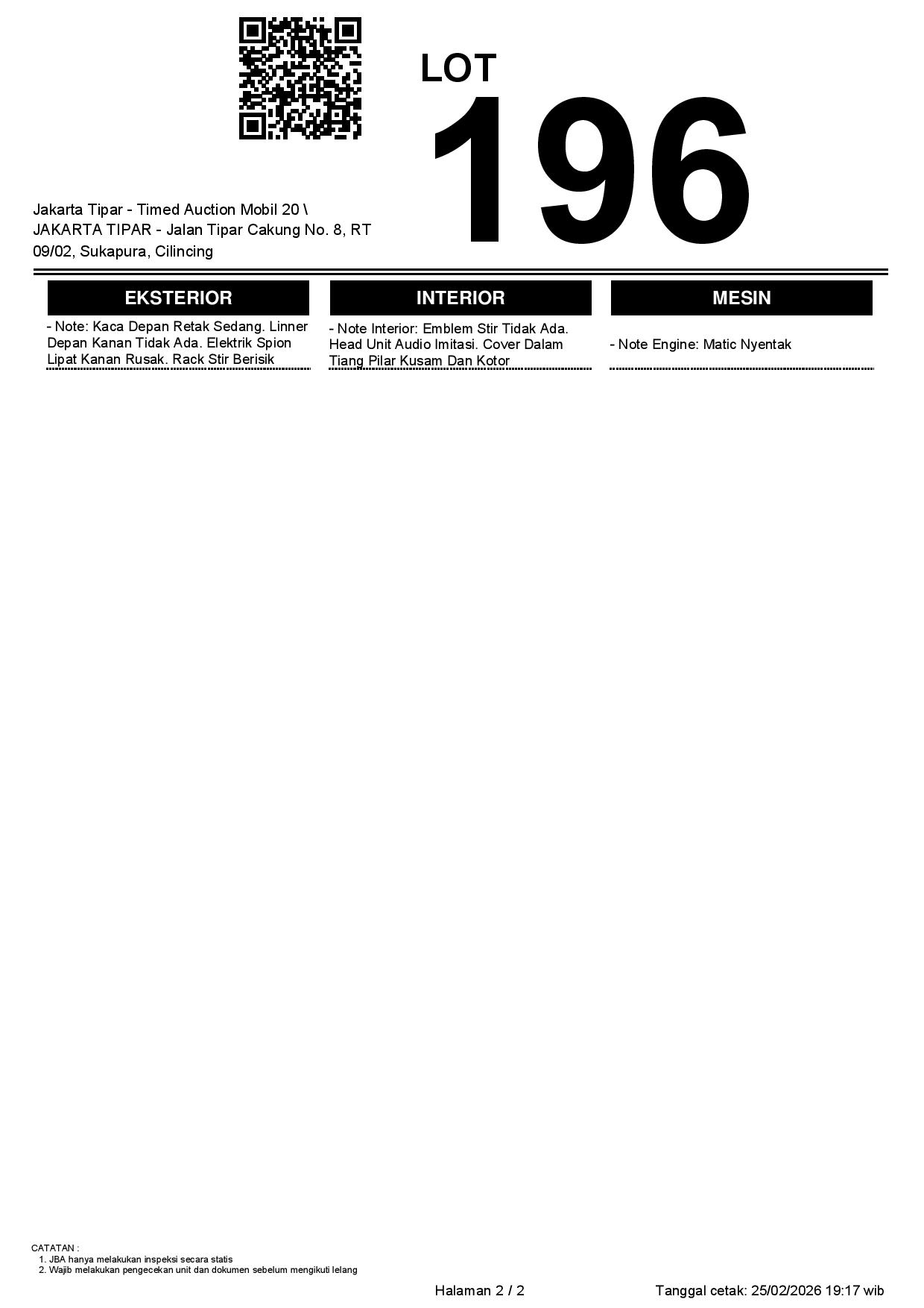 - Kondisi objek lelang dilelang apa adanya, baik kondisi fisik, mesin maupun legalitas kendaraan. Jika terdapat kekurangan/cacat baik yang terlihat maupun yang tidak terlihat, maka semua akan menjadi tanggung jawab/risiko Pemenang Lelang. Oleh karena itu, Pemenang Lelang melepaskan segala hak untuk menuntut dan/atau meminta ganti rugi atas hal tersebut kepada JBA.