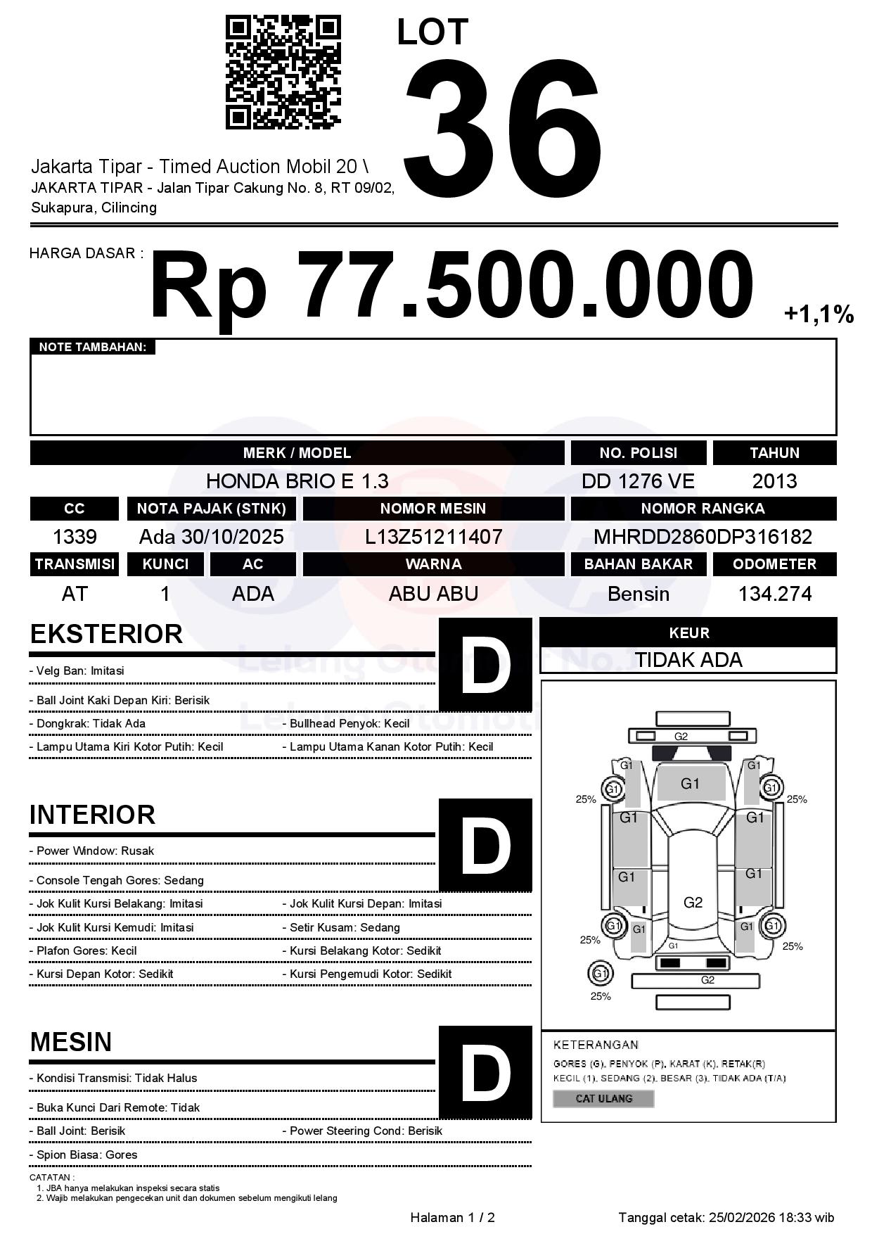 - Kondisi objek lelang dilelang apa adanya, baik kondisi fisik, mesin maupun legalitas kendaraan. Jika terdapat kekurangan/cacat baik yang terlihat maupun yang tidak terlihat, maka semua akan menjadi tanggung jawab/risiko Pemenang Lelang. Oleh karena itu, Pemenang Lelang melepaskan segala hak untuk menuntut dan/atau meminta ganti rugi atas hal tersebut kepada JBA.