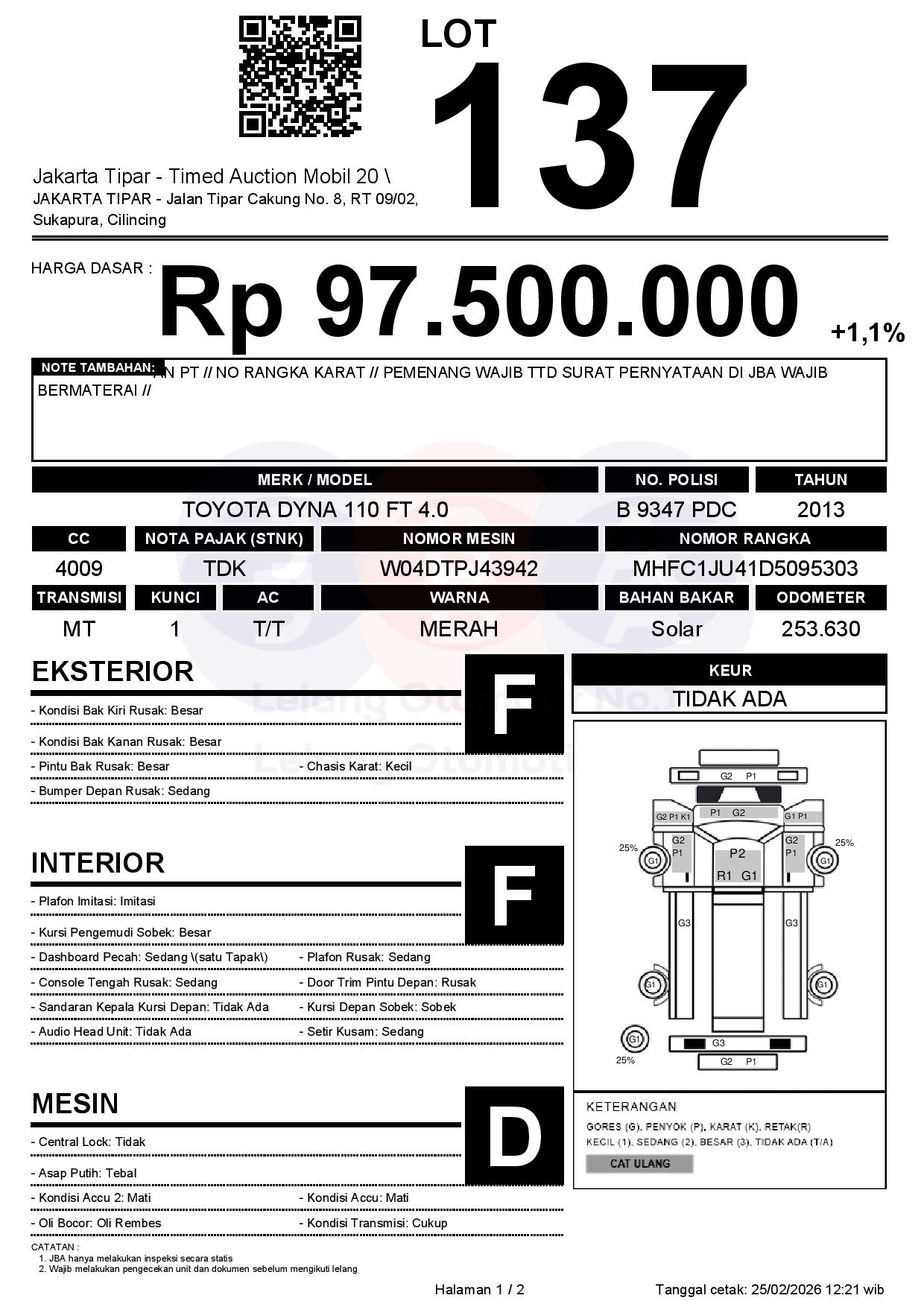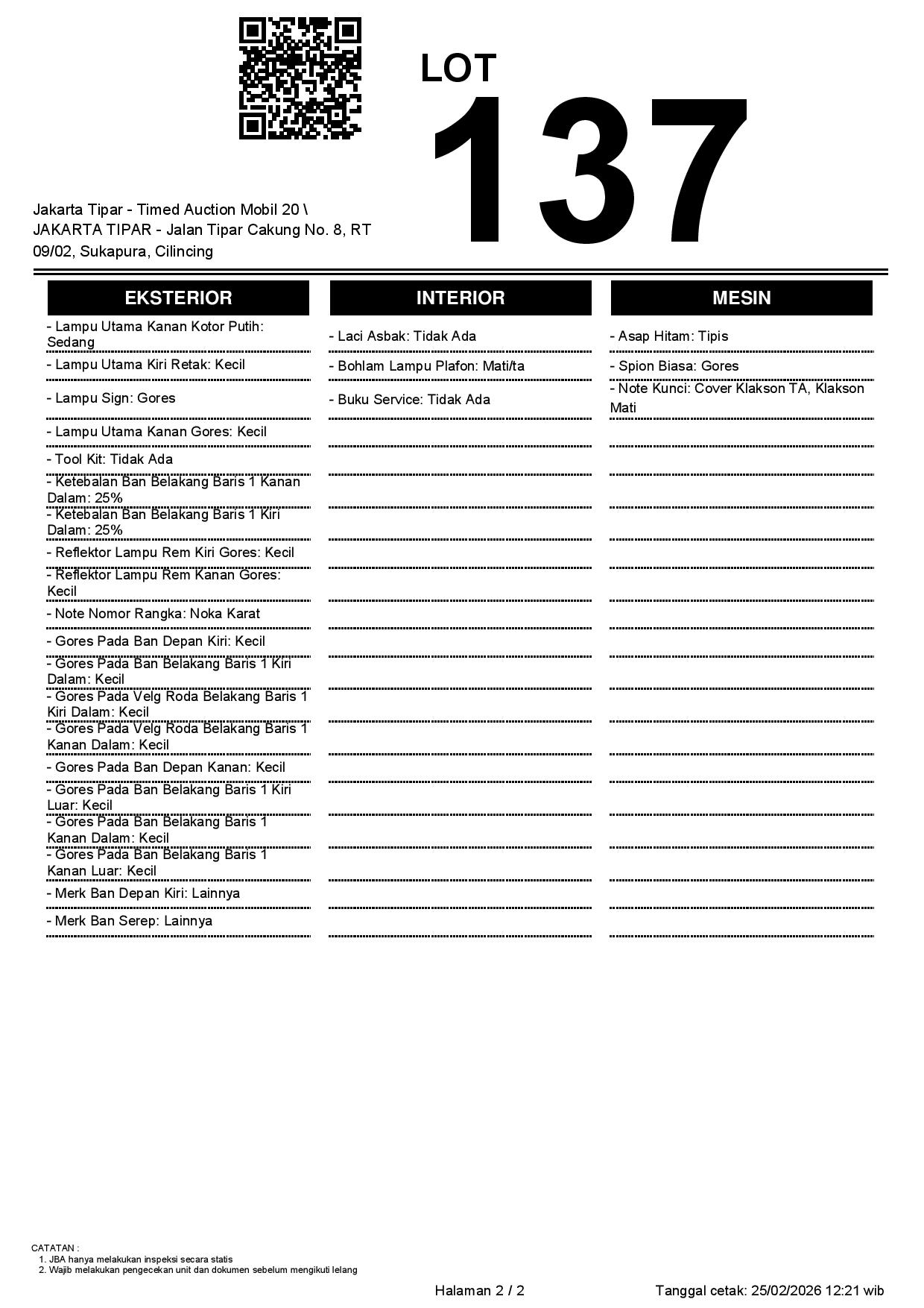 - Kondisi objek lelang dilelang apa adanya, baik kondisi fisik, mesin maupun legalitas kendaraan. Jika terdapat kekurangan/cacat baik yang terlihat maupun yang tidak terlihat, maka semua akan menjadi tanggung jawab/risiko Pemenang Lelang. Oleh karena itu, Pemenang Lelang melepaskan segala hak untuk menuntut dan/atau meminta ganti rugi atas hal tersebut kepada JBA.