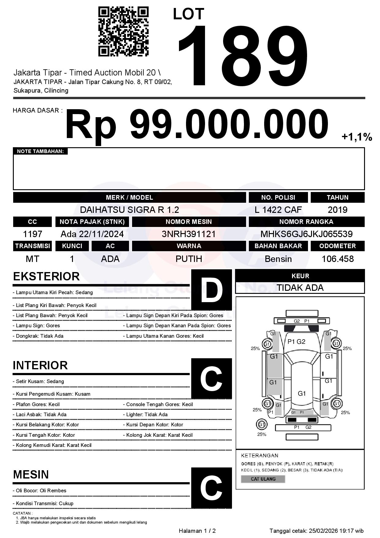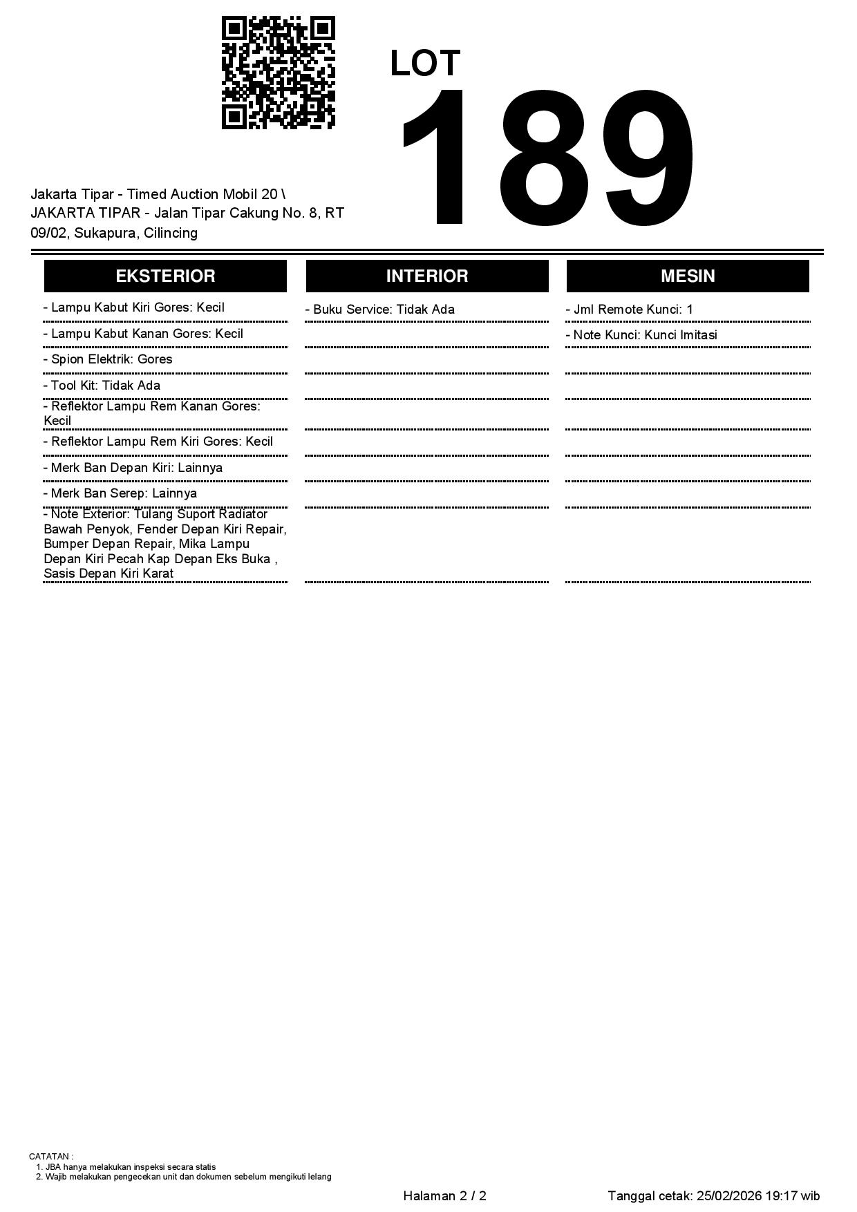 - Kondisi objek lelang dilelang apa adanya, baik kondisi fisik, mesin maupun legalitas kendaraan. Jika terdapat kekurangan/cacat baik yang terlihat maupun yang tidak terlihat, maka semua akan menjadi tanggung jawab/risiko Pemenang Lelang. Oleh karena itu, Pemenang Lelang melepaskan segala hak untuk menuntut dan/atau meminta ganti rugi atas hal tersebut kepada JBA.