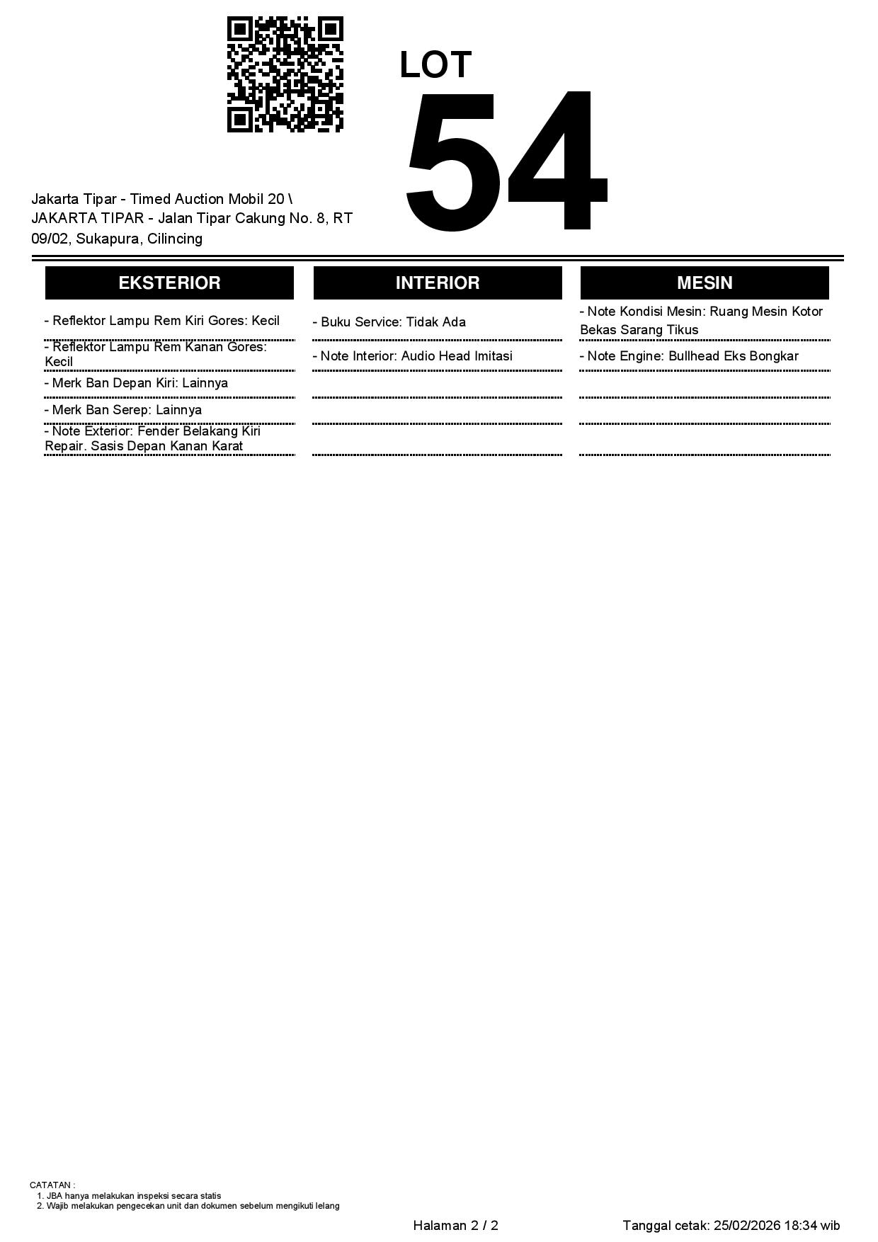 - Kondisi objek lelang dilelang apa adanya, baik kondisi fisik, mesin maupun legalitas kendaraan. Jika terdapat kekurangan/cacat baik yang terlihat maupun yang tidak terlihat, maka semua akan menjadi tanggung jawab/risiko Pemenang Lelang. Oleh karena itu, Pemenang Lelang melepaskan segala hak untuk menuntut dan/atau meminta ganti rugi atas hal tersebut kepada JBA.