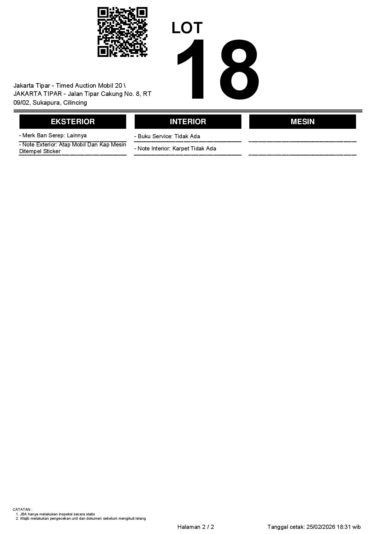 - Kondisi objek lelang dilelang apa adanya, baik kondisi fisik, mesin maupun legalitas kendaraan. Jika terdapat kekurangan/cacat baik yang terlihat maupun yang tidak terlihat, maka semua akan menjadi tanggung jawab/risiko Pemenang Lelang. Oleh karena itu, Pemenang Lelang melepaskan segala hak untuk menuntut dan/atau meminta ganti rugi atas hal tersebut kepada JBA.