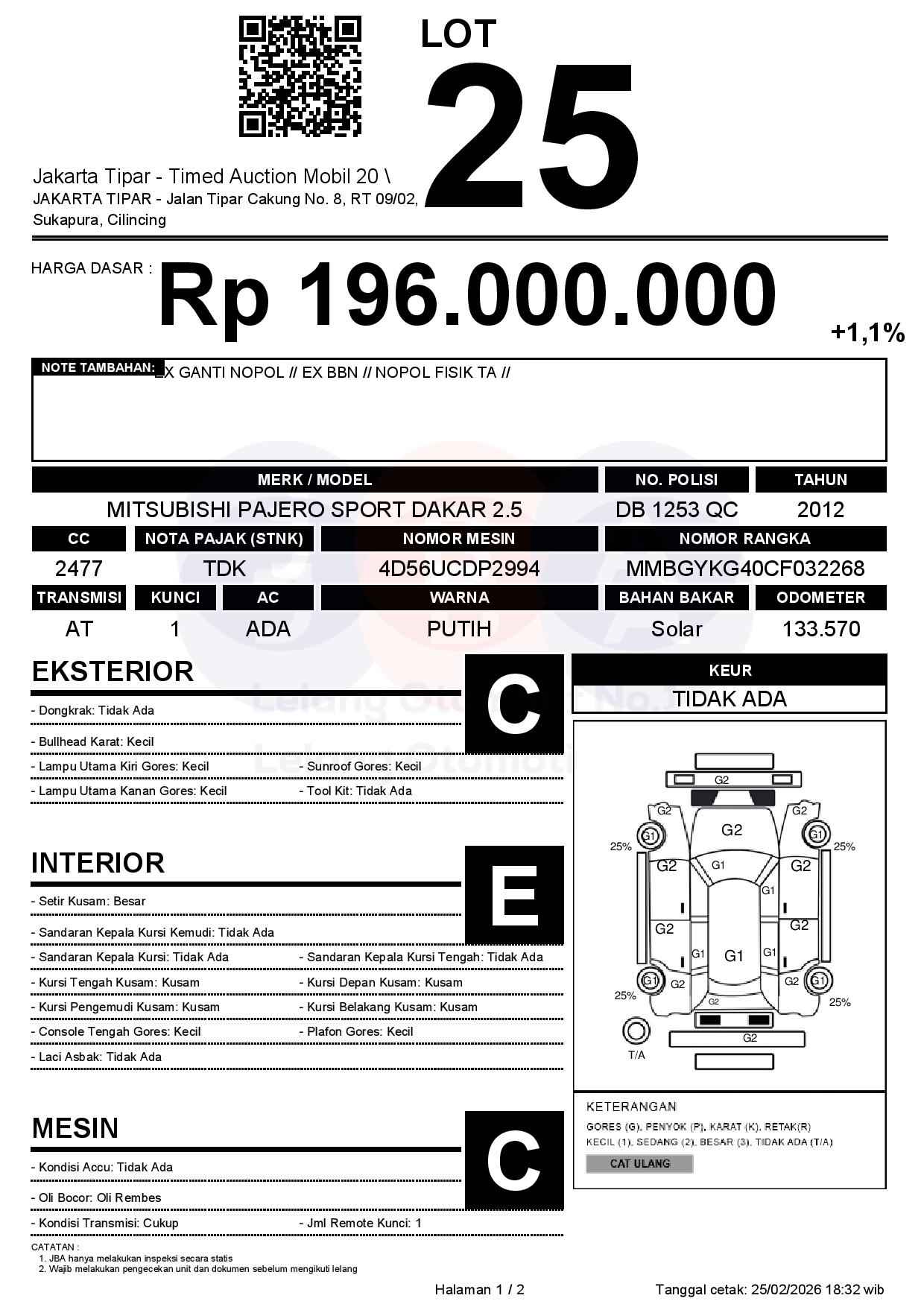 - Kondisi objek lelang dilelang apa adanya, baik kondisi fisik, mesin maupun legalitas kendaraan. Jika terdapat kekurangan/cacat baik yang terlihat maupun yang tidak terlihat, maka semua akan menjadi tanggung jawab/risiko Pemenang Lelang. Oleh karena itu, Pemenang Lelang melepaskan segala hak untuk menuntut dan/atau meminta ganti rugi atas hal tersebut kepada JBA.