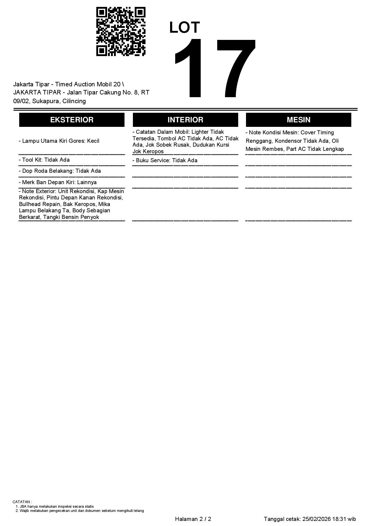 - Kondisi objek lelang dilelang apa adanya, baik kondisi fisik, mesin maupun legalitas kendaraan. Jika terdapat kekurangan/cacat baik yang terlihat maupun yang tidak terlihat, maka semua akan menjadi tanggung jawab/risiko Pemenang Lelang. Oleh karena itu, Pemenang Lelang melepaskan segala hak untuk menuntut dan/atau meminta ganti rugi atas hal tersebut kepada JBA.