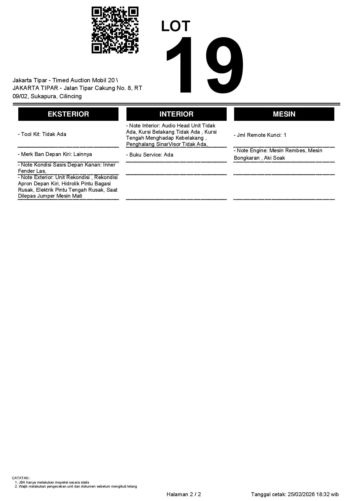 - Kondisi objek lelang dilelang apa adanya, baik kondisi fisik, mesin maupun legalitas kendaraan. Jika terdapat kekurangan/cacat baik yang terlihat maupun yang tidak terlihat, maka semua akan menjadi tanggung jawab/risiko Pemenang Lelang. Oleh karena itu, Pemenang Lelang melepaskan segala hak untuk menuntut dan/atau meminta ganti rugi atas hal tersebut kepada JBA.