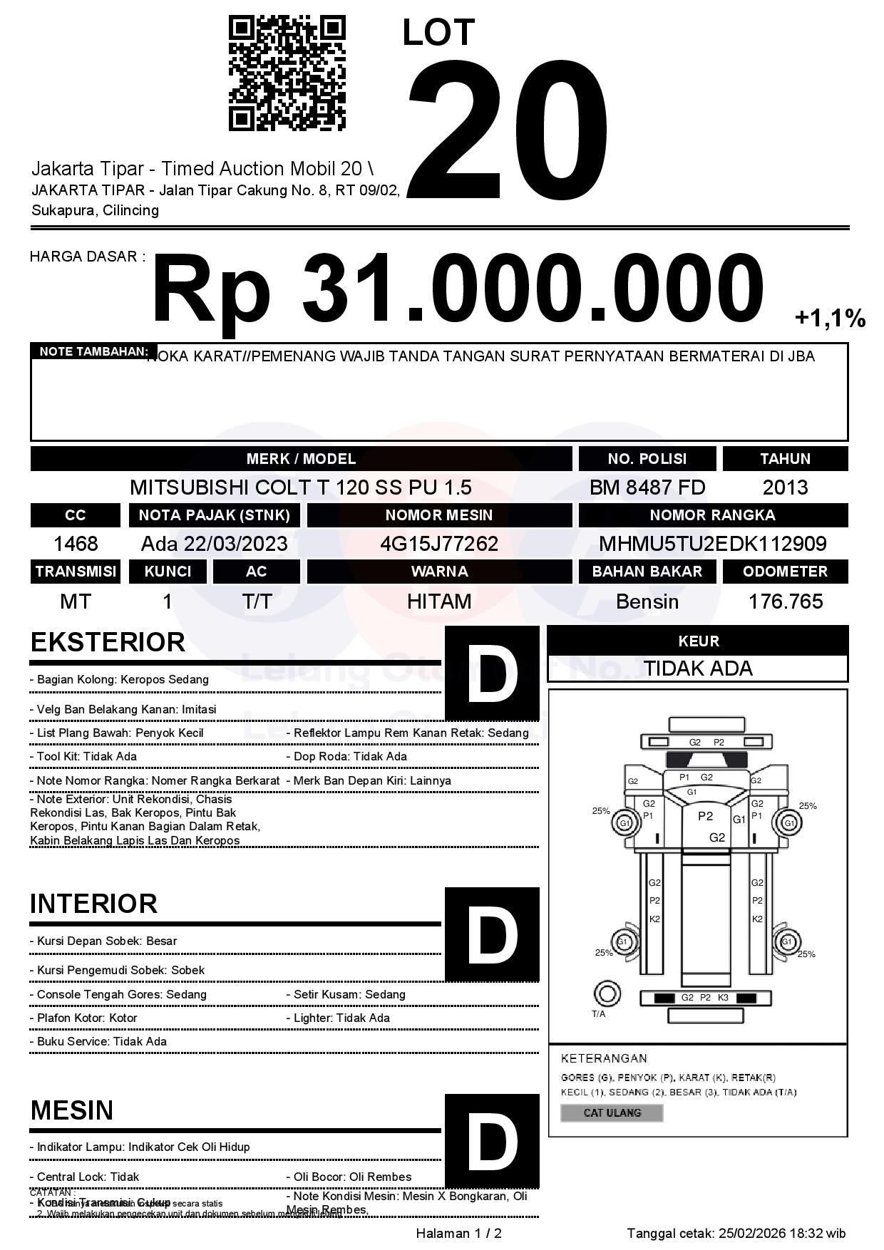 - Kondisi objek lelang dilelang apa adanya, baik kondisi fisik, mesin maupun legalitas kendaraan. Jika terdapat kekurangan/cacat baik yang terlihat maupun yang tidak terlihat, maka semua akan menjadi tanggung jawab/risiko Pemenang Lelang. Oleh karena itu, Pemenang Lelang melepaskan segala hak untuk menuntut dan/atau meminta ganti rugi atas hal tersebut kepada JBA.