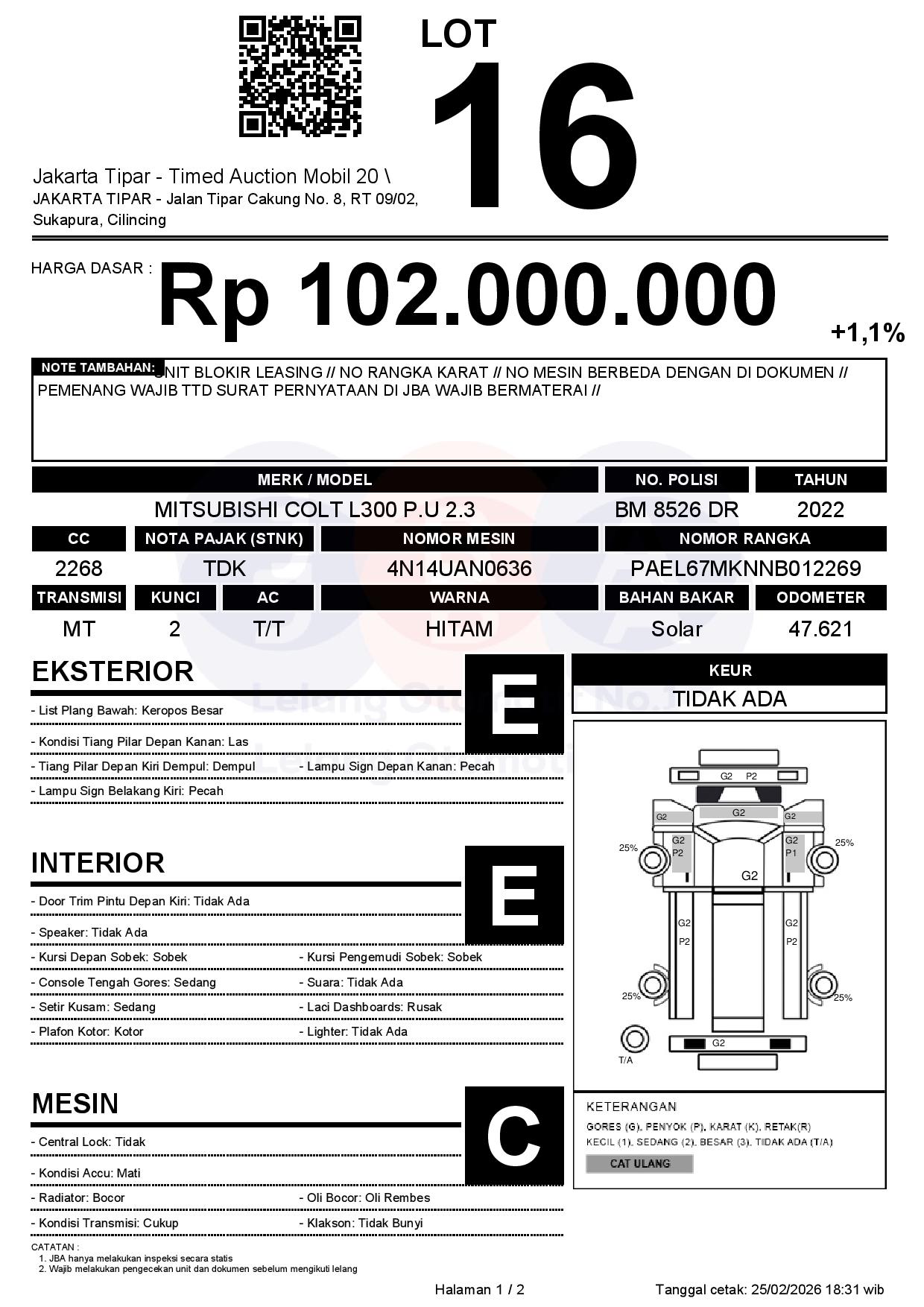 - Kondisi objek lelang dilelang apa adanya, baik kondisi fisik, mesin maupun legalitas kendaraan. Jika terdapat kekurangan/cacat baik yang terlihat maupun yang tidak terlihat, maka semua akan menjadi tanggung jawab/risiko Pemenang Lelang. Oleh karena itu, Pemenang Lelang melepaskan segala hak untuk menuntut dan/atau meminta ganti rugi atas hal tersebut kepada JBA.
