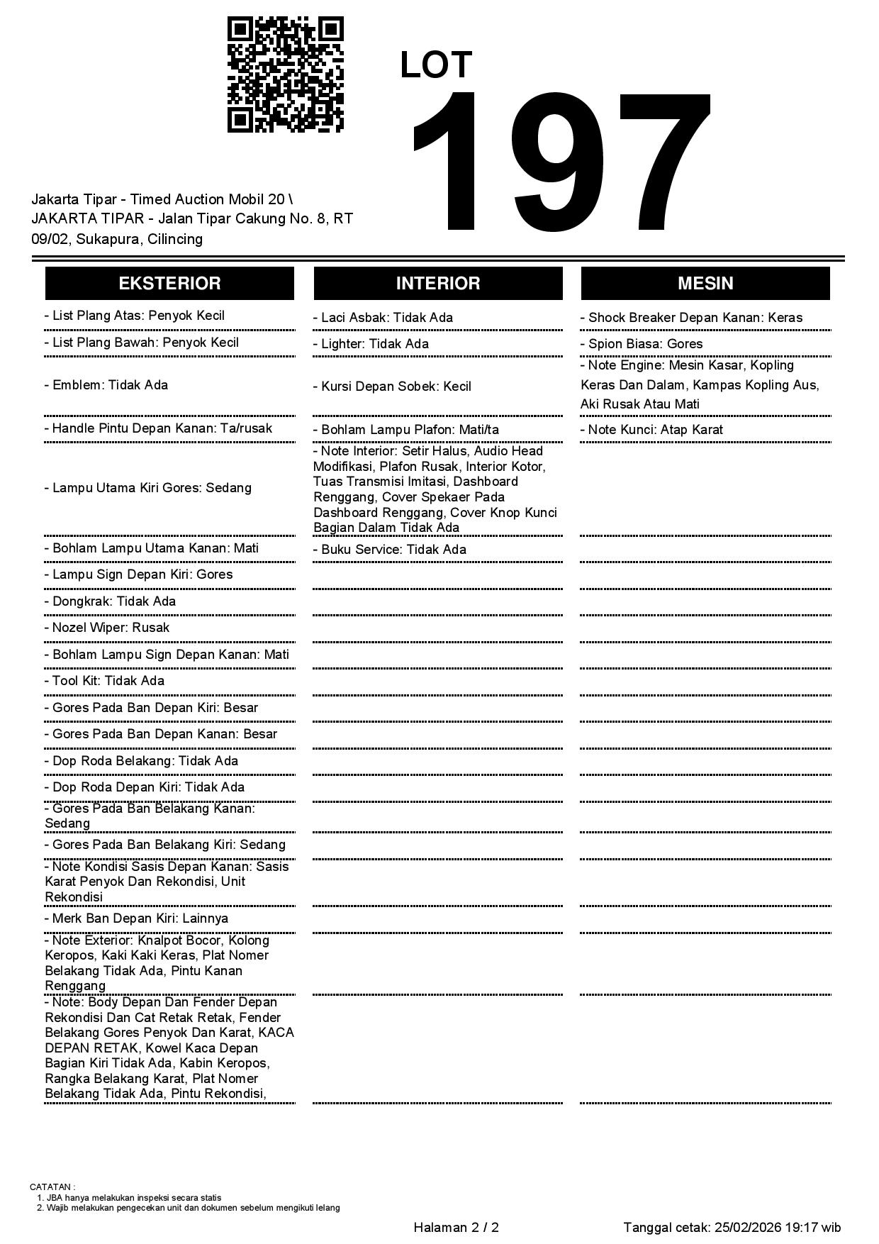 - Kondisi objek lelang dilelang apa adanya, baik kondisi fisik, mesin maupun legalitas kendaraan. Jika terdapat kekurangan/cacat baik yang terlihat maupun yang tidak terlihat, maka semua akan menjadi tanggung jawab/risiko Pemenang Lelang. Oleh karena itu, Pemenang Lelang melepaskan segala hak untuk menuntut dan/atau meminta ganti rugi atas hal tersebut kepada JBA.