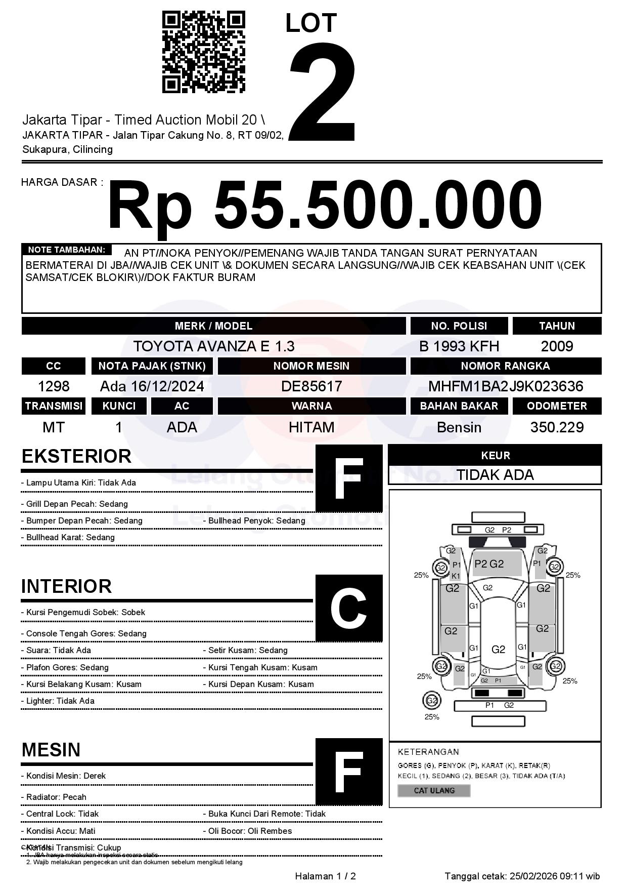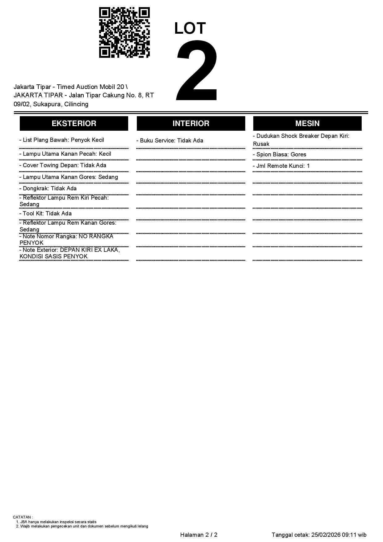 - Kondisi objek lelang dilelang apa adanya, baik kondisi fisik, mesin maupun legalitas kendaraan. Jika terdapat kekurangan/cacat baik yang terlihat maupun yang tidak terlihat, maka semua akan menjadi tanggung jawab/risiko Pemenang Lelang. Oleh karena itu, Pemenang Lelang melepaskan segala hak untuk menuntut dan/atau meminta ganti rugi atas hal tersebut kepada JBA.