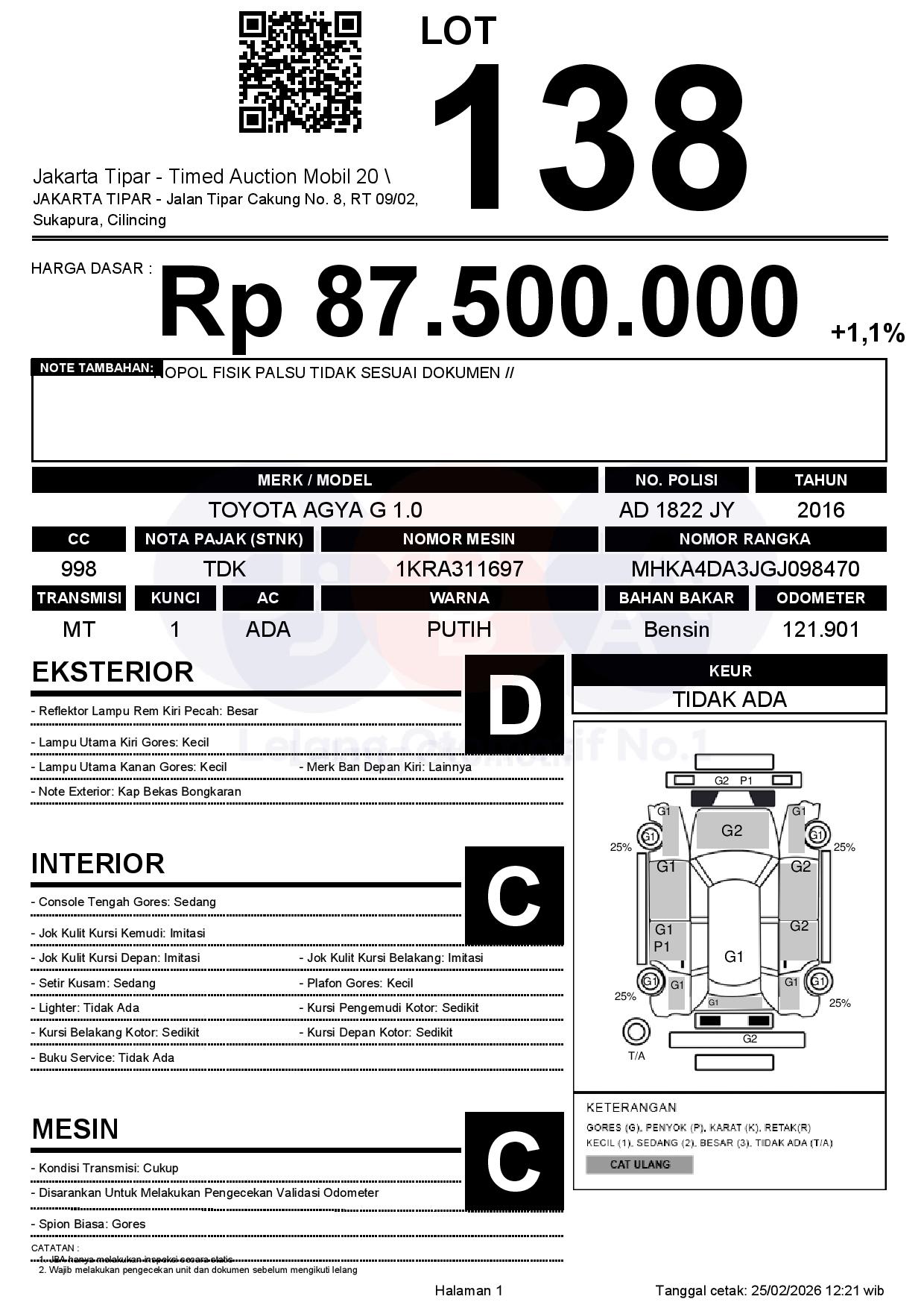 - Kondisi objek lelang dilelang apa adanya, baik kondisi fisik, mesin maupun legalitas kendaraan. Jika terdapat kekurangan/cacat baik yang terlihat maupun yang tidak terlihat, maka semua akan menjadi tanggung jawab/risiko Pemenang Lelang. Oleh karena itu, Pemenang Lelang melepaskan segala hak untuk menuntut dan/atau meminta ganti rugi atas hal tersebut kepada JBA.