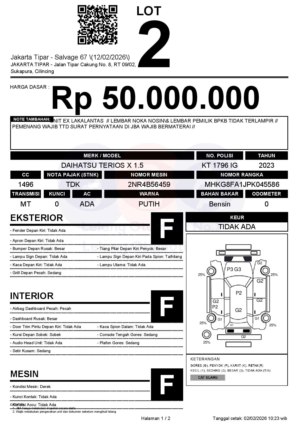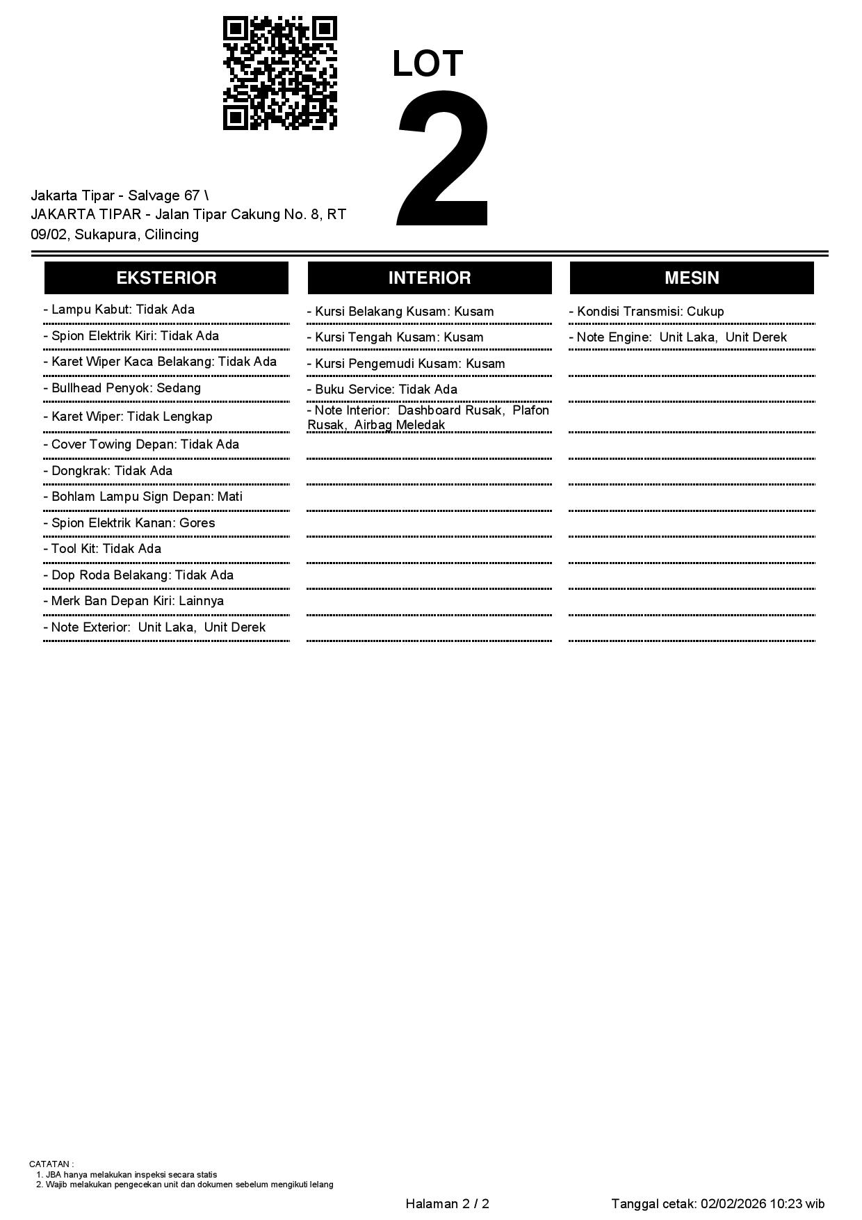 - Kondisi objek lelang dilelang apa adanya, baik kondisi fisik, mesin maupun legalitas kendaraan. Jika terdapat kekurangan/cacat baik yang terlihat maupun yang tidak terlihat, maka semua akan menjadi tanggung jawab/risiko Pemenang Lelang. Oleh karena itu, Pemenang Lelang melepaskan segala hak untuk menuntut dan/atau meminta ganti rugi atas hal tersebut kepada JBA.