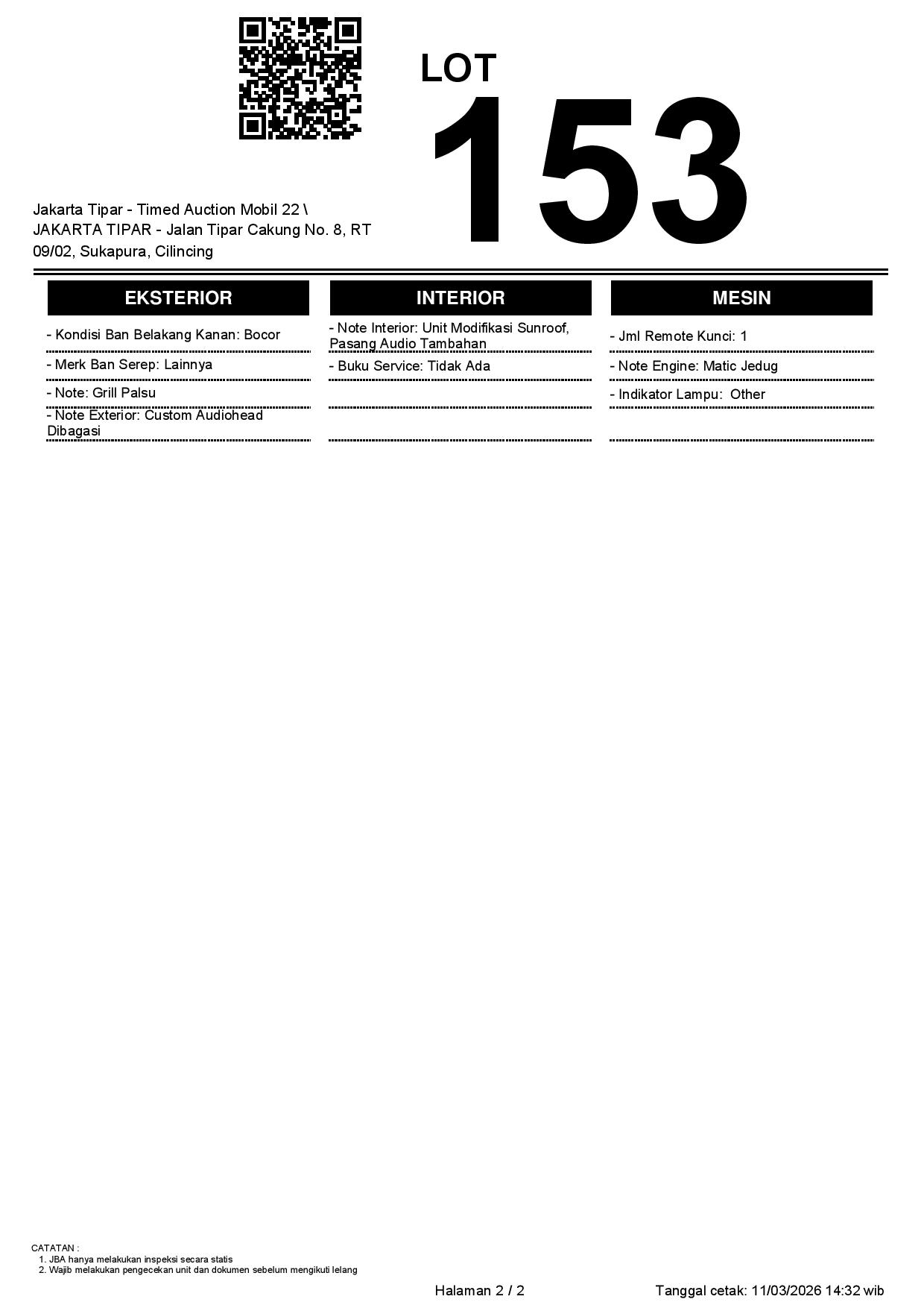 - Kondisi objek lelang dilelang apa adanya, baik kondisi fisik, mesin maupun legalitas kendaraan. Jika terdapat kekurangan/cacat baik yang terlihat maupun yang tidak terlihat, maka semua akan menjadi tanggung jawab/risiko Pemenang Lelang. Oleh karena itu, Pemenang Lelang melepaskan segala hak untuk menuntut dan/atau meminta ganti rugi atas hal tersebut kepada JBA.