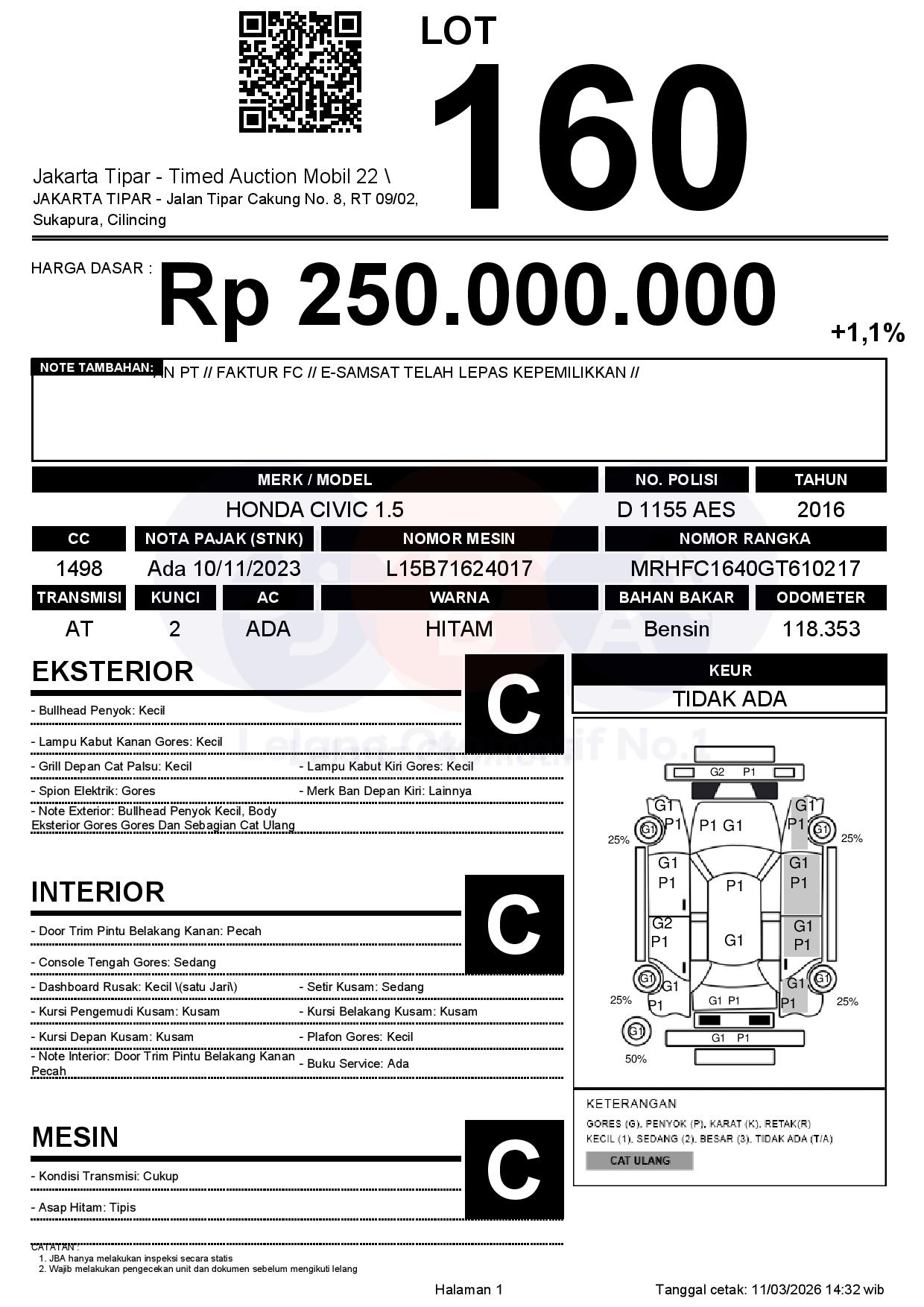 - Kondisi objek lelang dilelang apa adanya, baik kondisi fisik, mesin maupun legalitas kendaraan. Jika terdapat kekurangan/cacat baik yang terlihat maupun yang tidak terlihat, maka semua akan menjadi tanggung jawab/risiko Pemenang Lelang. Oleh karena itu, Pemenang Lelang melepaskan segala hak untuk menuntut dan/atau meminta ganti rugi atas hal tersebut kepada JBA.