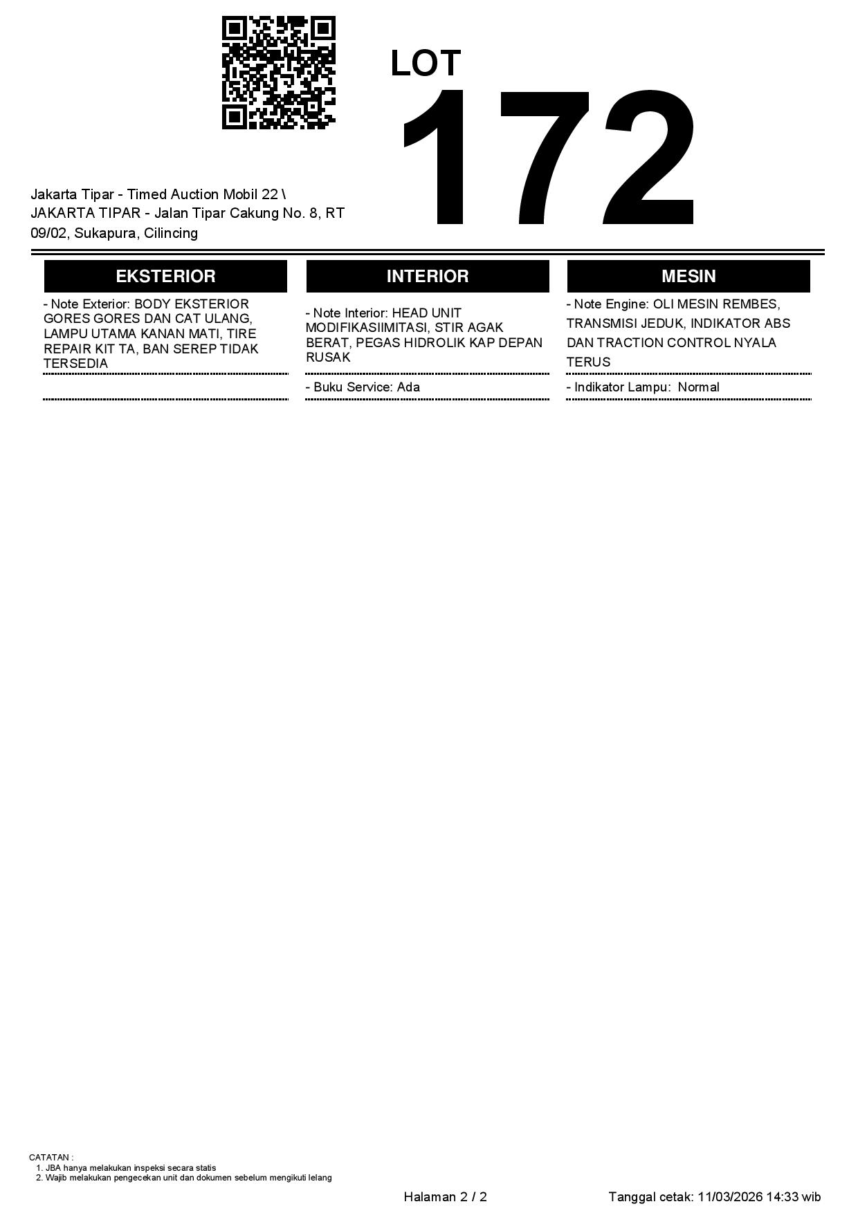 - Kondisi objek lelang dilelang apa adanya, baik kondisi fisik, mesin maupun legalitas kendaraan. Jika terdapat kekurangan/cacat baik yang terlihat maupun yang tidak terlihat, maka semua akan menjadi tanggung jawab/risiko Pemenang Lelang. Oleh karena itu, Pemenang Lelang melepaskan segala hak untuk menuntut dan/atau meminta ganti rugi atas hal tersebut kepada JBA.