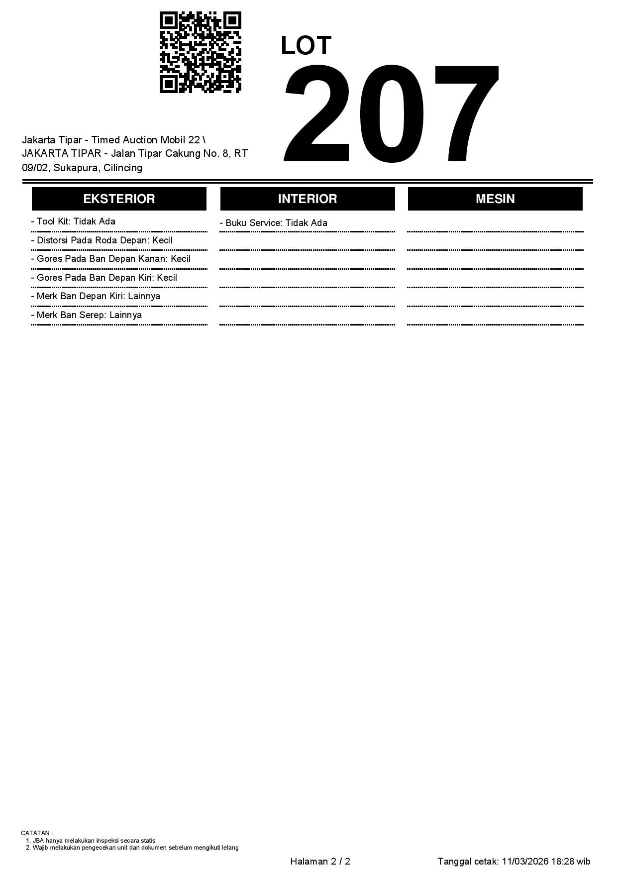 - Kondisi objek lelang dilelang apa adanya, baik kondisi fisik, mesin maupun legalitas kendaraan. Jika terdapat kekurangan/cacat baik yang terlihat maupun yang tidak terlihat, maka semua akan menjadi tanggung jawab/risiko Pemenang Lelang. Oleh karena itu, Pemenang Lelang melepaskan segala hak untuk menuntut dan/atau meminta ganti rugi atas hal tersebut kepada JBA.
