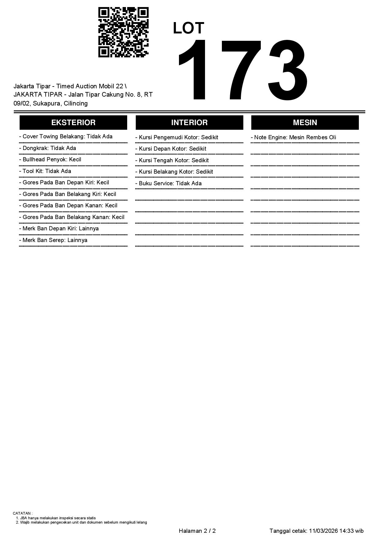 - Kondisi objek lelang dilelang apa adanya, baik kondisi fisik, mesin maupun legalitas kendaraan. Jika terdapat kekurangan/cacat baik yang terlihat maupun yang tidak terlihat, maka semua akan menjadi tanggung jawab/risiko Pemenang Lelang. Oleh karena itu, Pemenang Lelang melepaskan segala hak untuk menuntut dan/atau meminta ganti rugi atas hal tersebut kepada JBA.