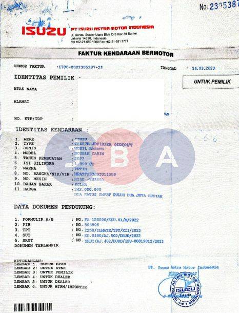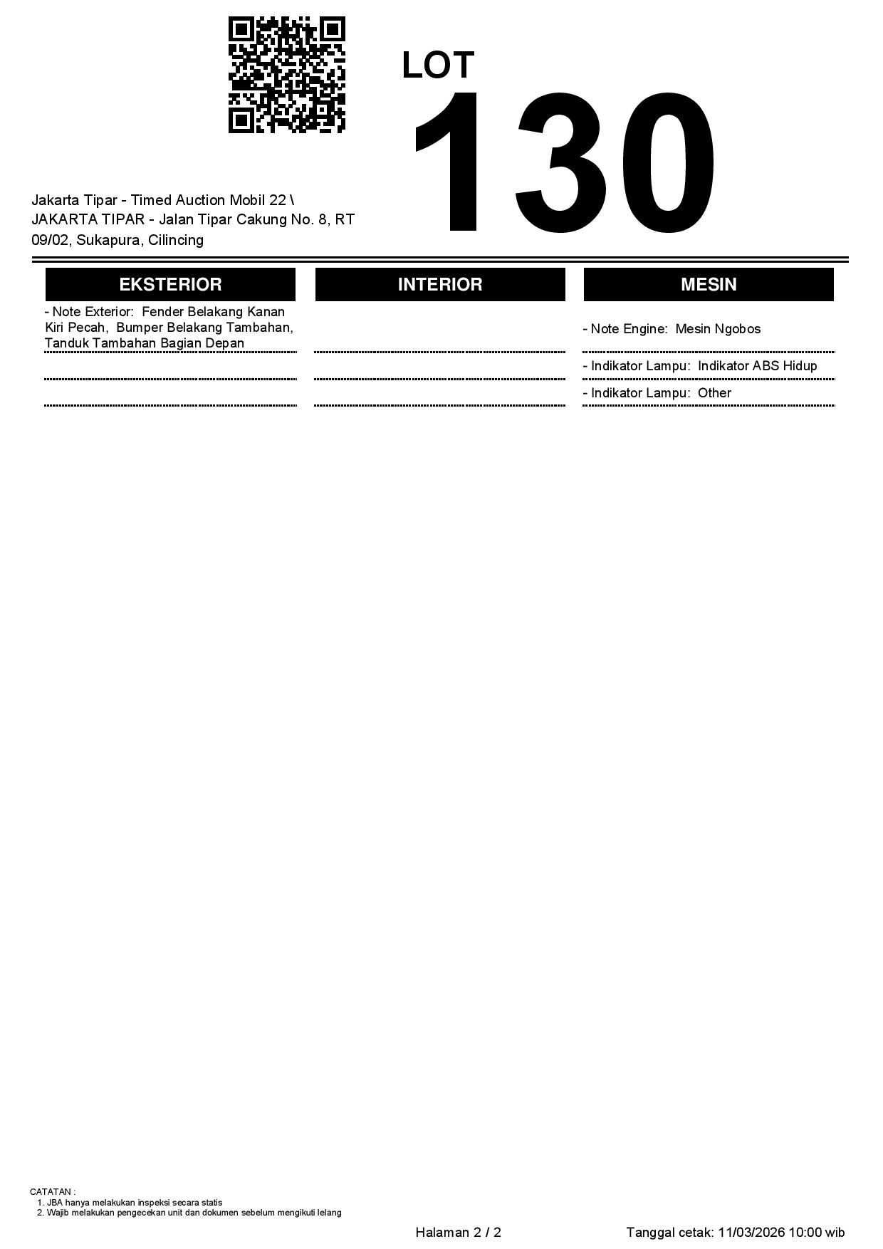 - Kondisi objek lelang dilelang apa adanya, baik kondisi fisik, mesin maupun legalitas kendaraan. Jika terdapat kekurangan/cacat baik yang terlihat maupun yang tidak terlihat, maka semua akan menjadi tanggung jawab/risiko Pemenang Lelang. Oleh karena itu, Pemenang Lelang melepaskan segala hak untuk menuntut dan/atau meminta ganti rugi atas hal tersebut kepada JBA.