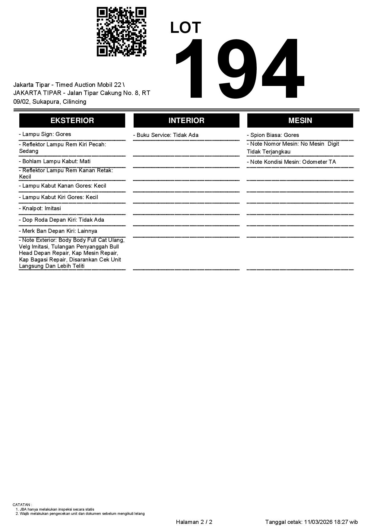- Kondisi objek lelang dilelang apa adanya, baik kondisi fisik, mesin maupun legalitas kendaraan. Jika terdapat kekurangan/cacat baik yang terlihat maupun yang tidak terlihat, maka semua akan menjadi tanggung jawab/risiko Pemenang Lelang. Oleh karena itu, Pemenang Lelang melepaskan segala hak untuk menuntut dan/atau meminta ganti rugi atas hal tersebut kepada JBA.