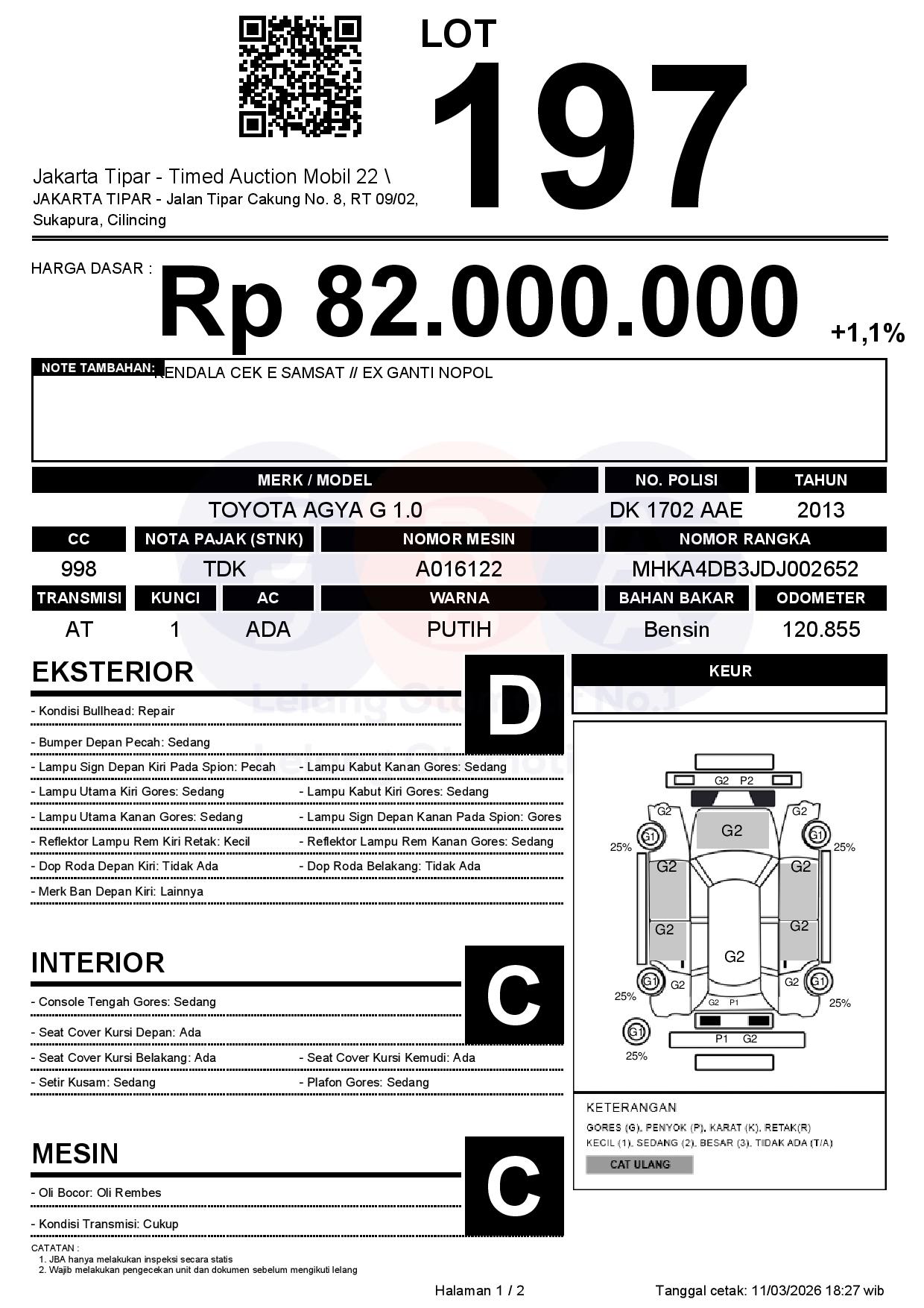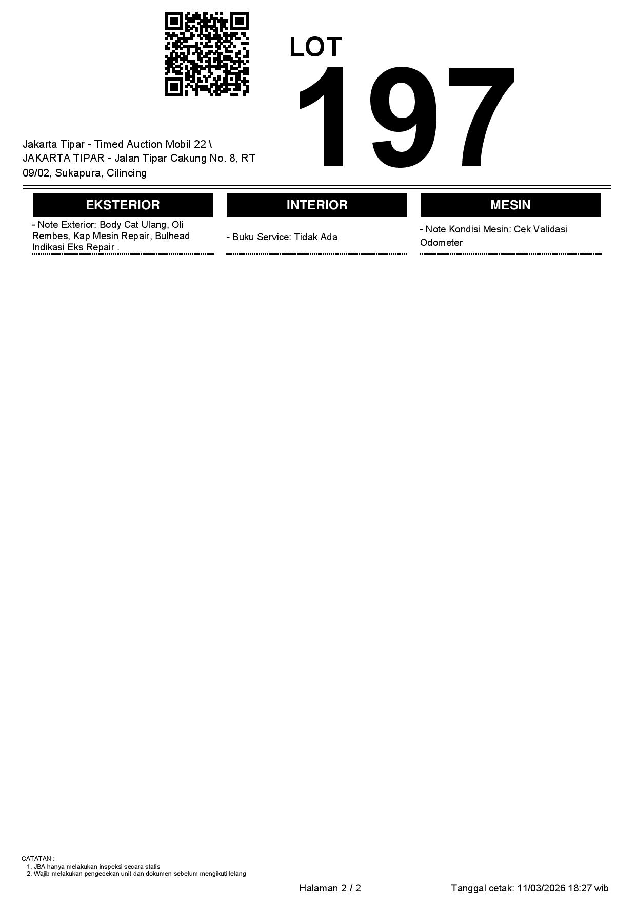 - Kondisi objek lelang dilelang apa adanya, baik kondisi fisik, mesin maupun legalitas kendaraan. Jika terdapat kekurangan/cacat baik yang terlihat maupun yang tidak terlihat, maka semua akan menjadi tanggung jawab/risiko Pemenang Lelang. Oleh karena itu, Pemenang Lelang melepaskan segala hak untuk menuntut dan/atau meminta ganti rugi atas hal tersebut kepada JBA.