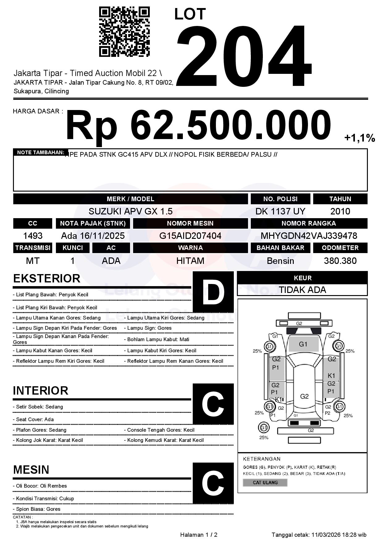 - Kondisi objek lelang dilelang apa adanya, baik kondisi fisik, mesin maupun legalitas kendaraan. Jika terdapat kekurangan/cacat baik yang terlihat maupun yang tidak terlihat, maka semua akan menjadi tanggung jawab/risiko Pemenang Lelang. Oleh karena itu, Pemenang Lelang melepaskan segala hak untuk menuntut dan/atau meminta ganti rugi atas hal tersebut kepada JBA.