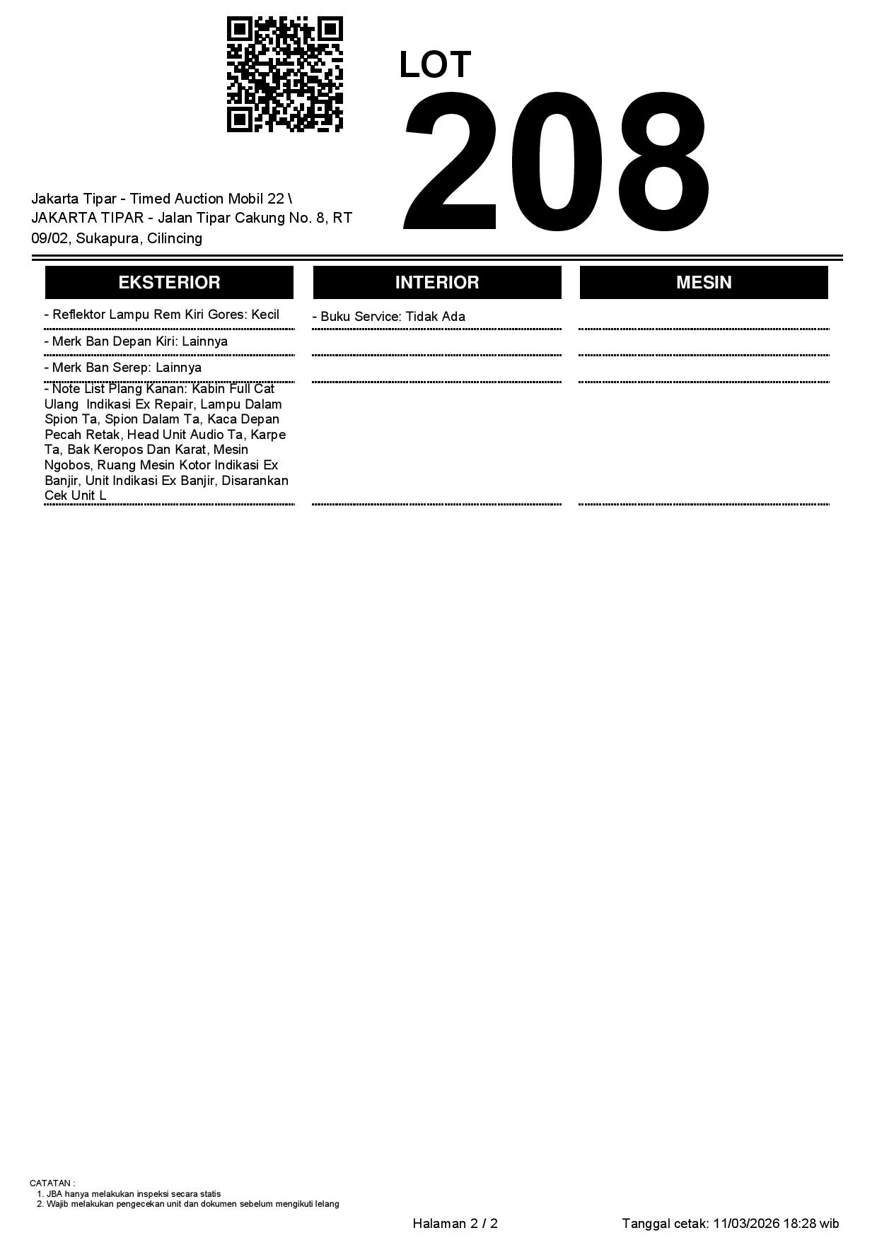 - Kondisi objek lelang dilelang apa adanya, baik kondisi fisik, mesin maupun legalitas kendaraan. Jika terdapat kekurangan/cacat baik yang terlihat maupun yang tidak terlihat, maka semua akan menjadi tanggung jawab/risiko Pemenang Lelang. Oleh karena itu, Pemenang Lelang melepaskan segala hak untuk menuntut dan/atau meminta ganti rugi atas hal tersebut kepada JBA.