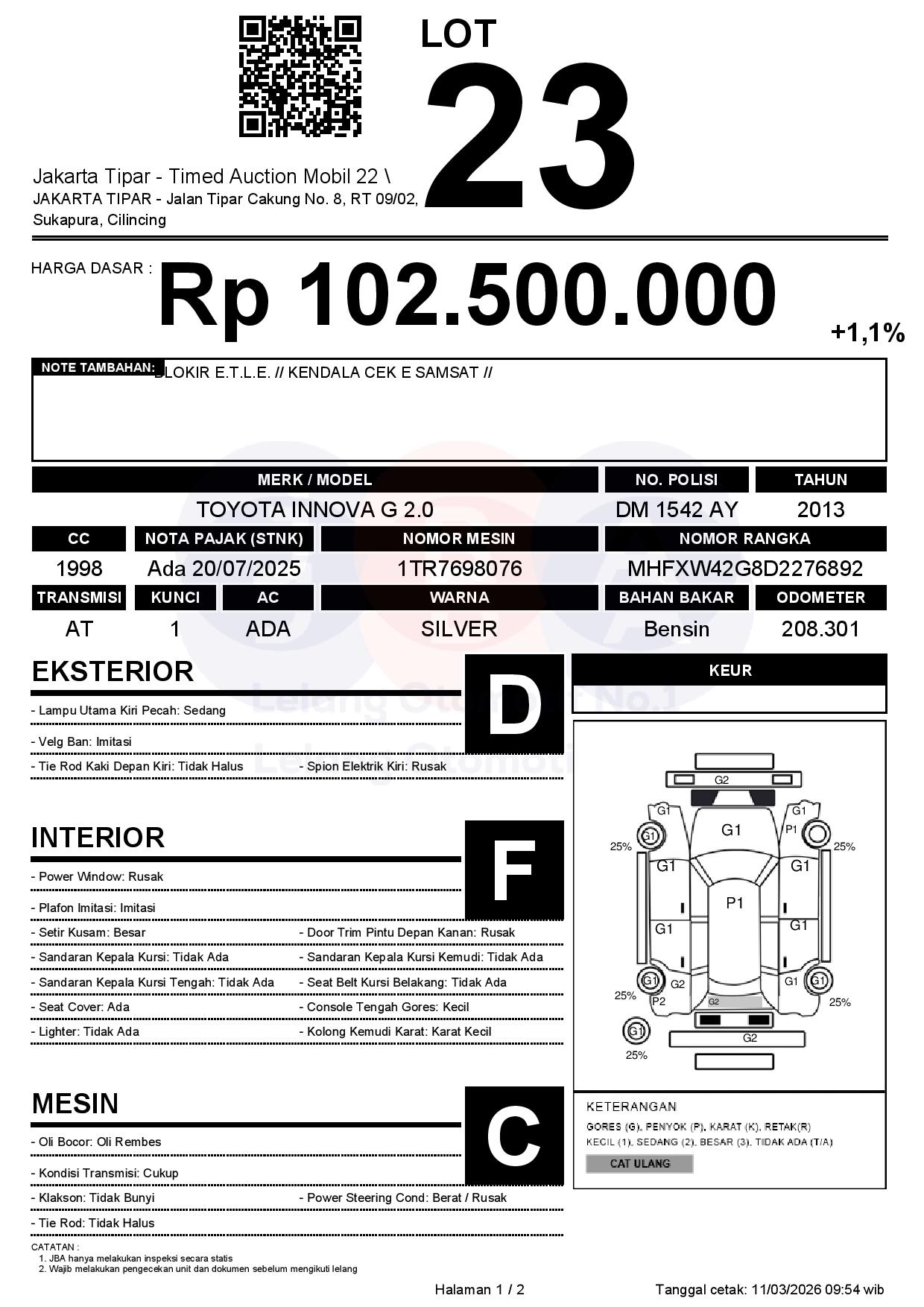 - Kondisi objek lelang dilelang apa adanya, baik kondisi fisik, mesin maupun legalitas kendaraan. Jika terdapat kekurangan/cacat baik yang terlihat maupun yang tidak terlihat, maka semua akan menjadi tanggung jawab/risiko Pemenang Lelang. Oleh karena itu, Pemenang Lelang melepaskan segala hak untuk menuntut dan/atau meminta ganti rugi atas hal tersebut kepada JBA.