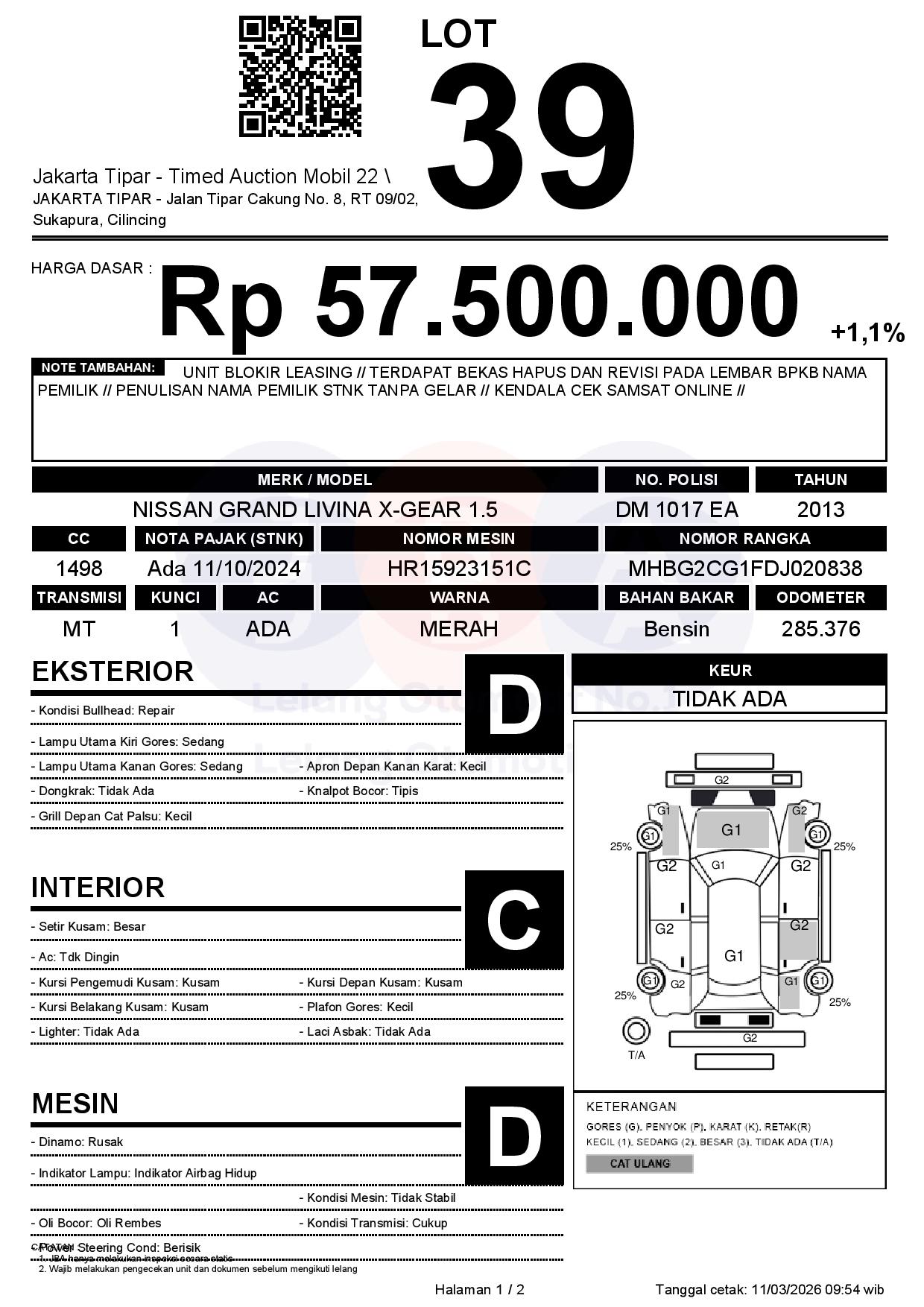 - Kondisi objek lelang dilelang apa adanya, baik kondisi fisik, mesin maupun legalitas kendaraan. Jika terdapat kekurangan/cacat baik yang terlihat maupun yang tidak terlihat, maka semua akan menjadi tanggung jawab/risiko Pemenang Lelang. Oleh karena itu, Pemenang Lelang melepaskan segala hak untuk menuntut dan/atau meminta ganti rugi atas hal tersebut kepada JBA.