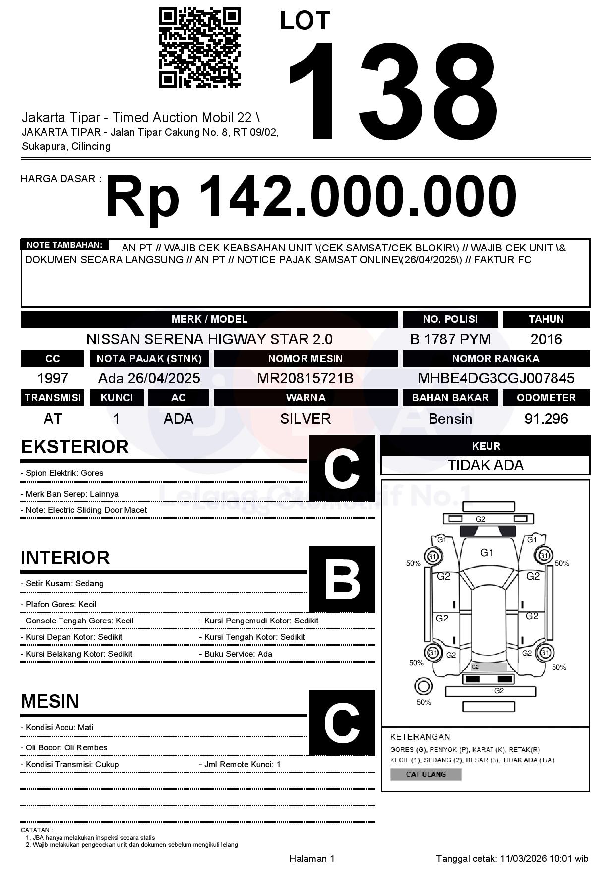 - Kondisi objek lelang dilelang apa adanya, baik kondisi fisik, mesin maupun legalitas kendaraan. Jika terdapat kekurangan/cacat baik yang terlihat maupun yang tidak terlihat, maka semua akan menjadi tanggung jawab/risiko Pemenang Lelang. Oleh karena itu, Pemenang Lelang melepaskan segala hak untuk menuntut dan/atau meminta ganti rugi atas hal tersebut kepada JBA.