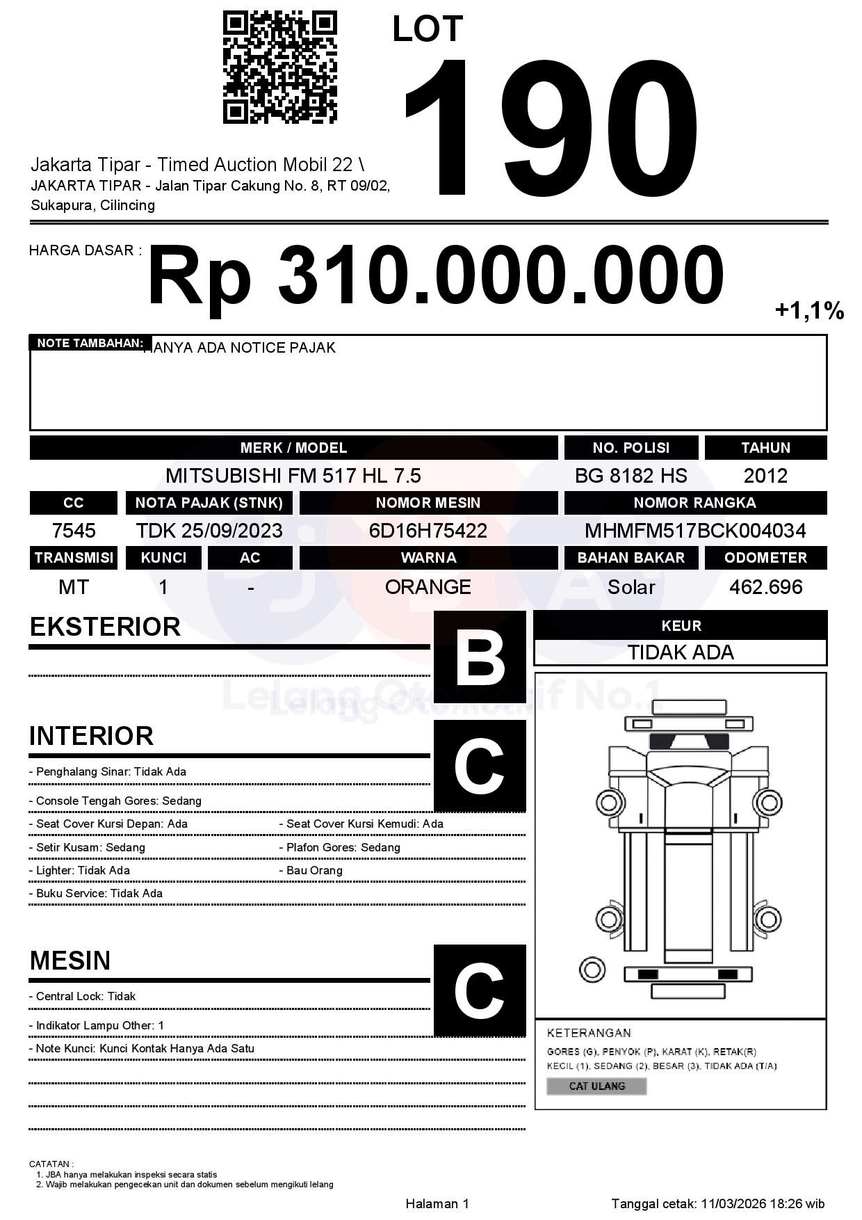 - Kondisi objek lelang dilelang apa adanya, baik kondisi fisik, mesin maupun legalitas kendaraan. Jika terdapat kekurangan/cacat baik yang terlihat maupun yang tidak terlihat, maka semua akan menjadi tanggung jawab/risiko Pemenang Lelang. Oleh karena itu, Pemenang Lelang melepaskan segala hak untuk menuntut dan/atau meminta ganti rugi atas hal tersebut kepada JBA.