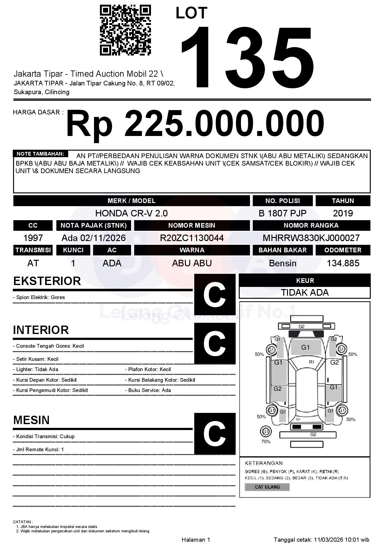- Kondisi objek lelang dilelang apa adanya, baik kondisi fisik, mesin maupun legalitas kendaraan. Jika terdapat kekurangan/cacat baik yang terlihat maupun yang tidak terlihat, maka semua akan menjadi tanggung jawab/risiko Pemenang Lelang. Oleh karena itu, Pemenang Lelang melepaskan segala hak untuk menuntut dan/atau meminta ganti rugi atas hal tersebut kepada JBA.