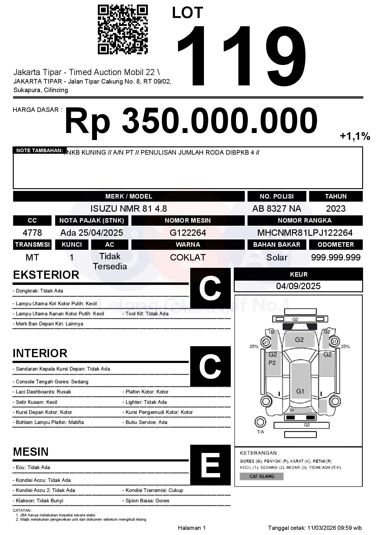 - Kondisi objek lelang dilelang apa adanya, baik kondisi fisik, mesin maupun legalitas kendaraan. Jika terdapat kekurangan/cacat baik yang terlihat maupun yang tidak terlihat, maka semua akan menjadi tanggung jawab/risiko Pemenang Lelang. Oleh karena itu, Pemenang Lelang melepaskan segala hak untuk menuntut dan/atau meminta ganti rugi atas hal tersebut kepada JBA.
