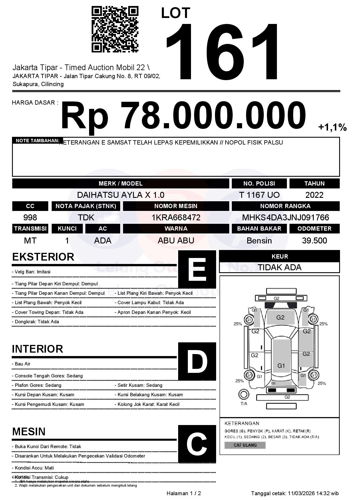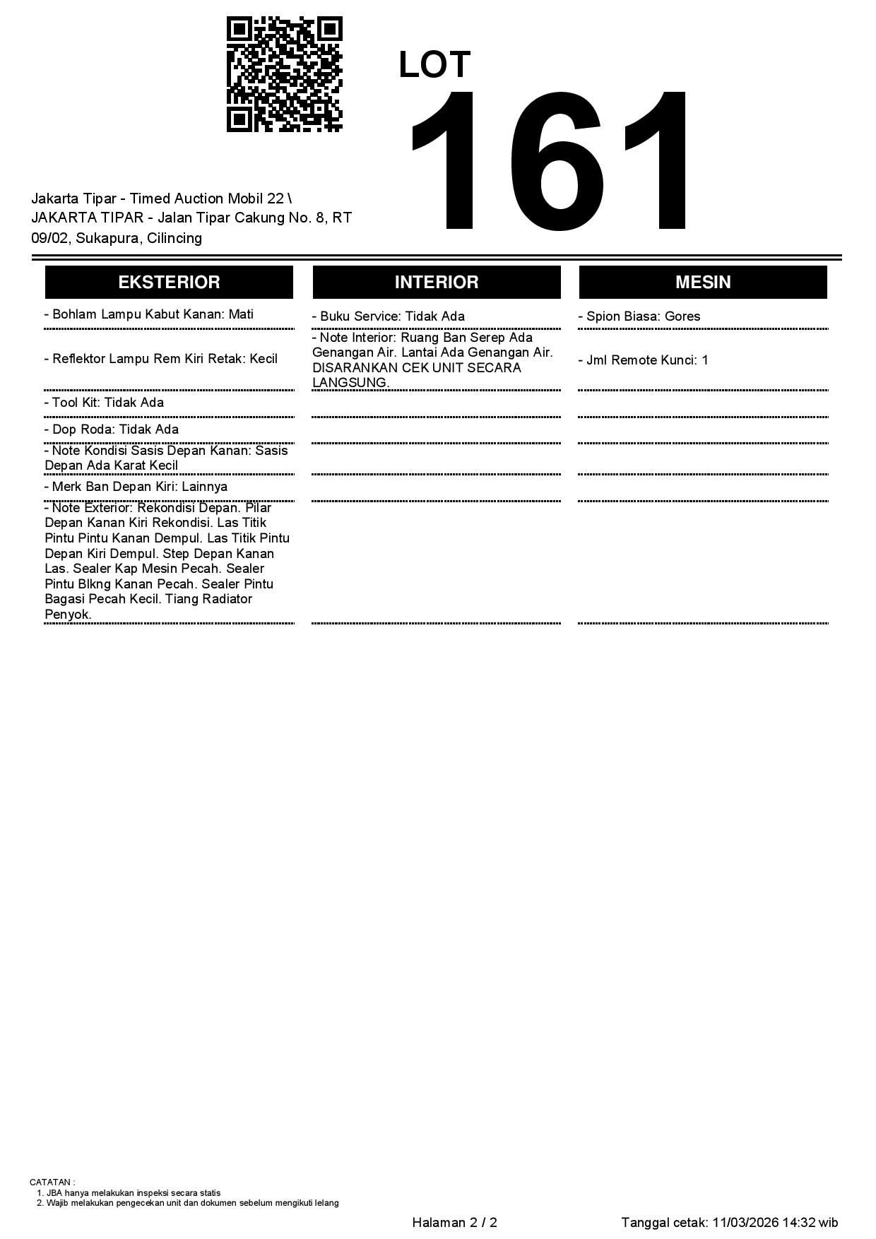 - Kondisi objek lelang dilelang apa adanya, baik kondisi fisik, mesin maupun legalitas kendaraan. Jika terdapat kekurangan/cacat baik yang terlihat maupun yang tidak terlihat, maka semua akan menjadi tanggung jawab/risiko Pemenang Lelang. Oleh karena itu, Pemenang Lelang melepaskan segala hak untuk menuntut dan/atau meminta ganti rugi atas hal tersebut kepada JBA.
