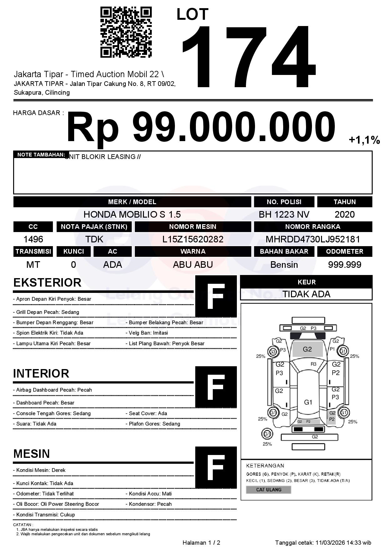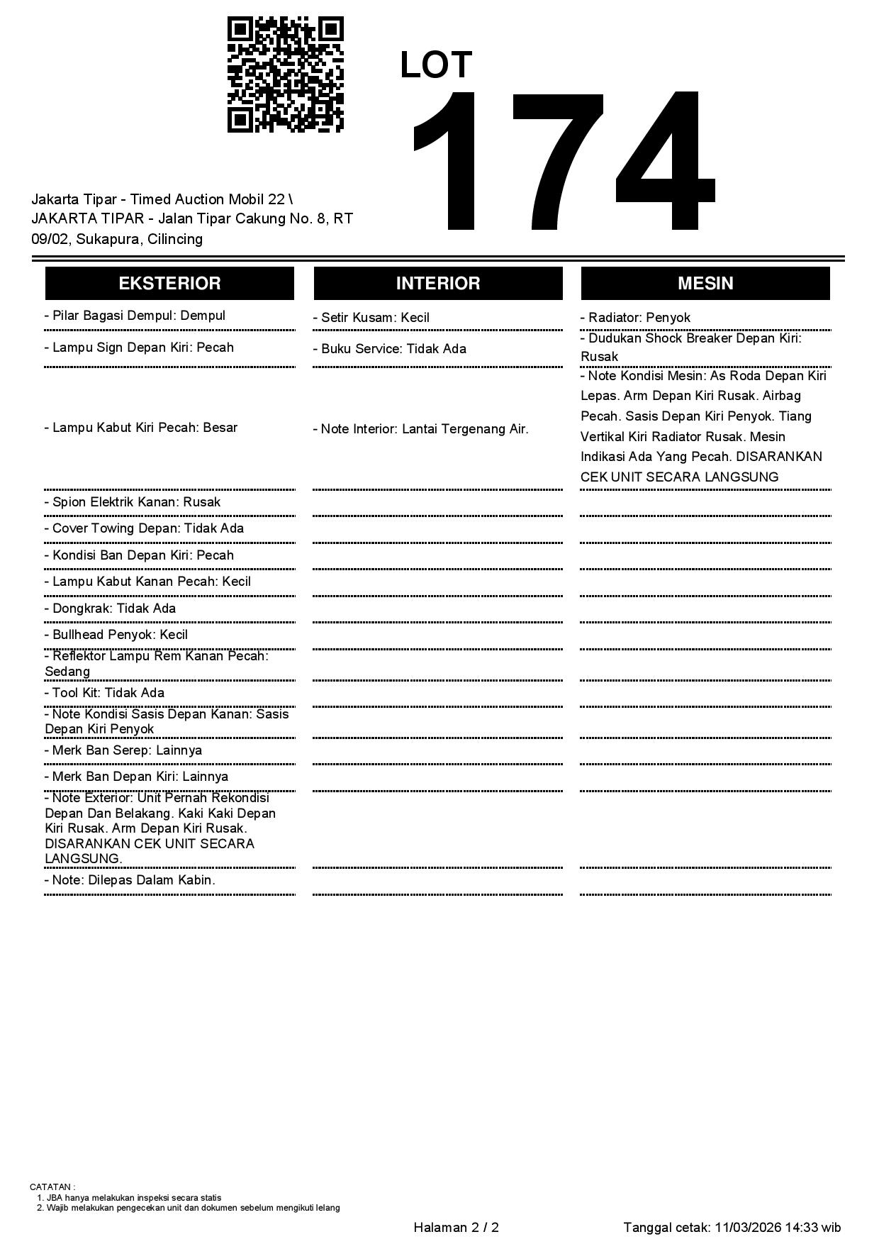 - Kondisi objek lelang dilelang apa adanya, baik kondisi fisik, mesin maupun legalitas kendaraan. Jika terdapat kekurangan/cacat baik yang terlihat maupun yang tidak terlihat, maka semua akan menjadi tanggung jawab/risiko Pemenang Lelang. Oleh karena itu, Pemenang Lelang melepaskan segala hak untuk menuntut dan/atau meminta ganti rugi atas hal tersebut kepada JBA.