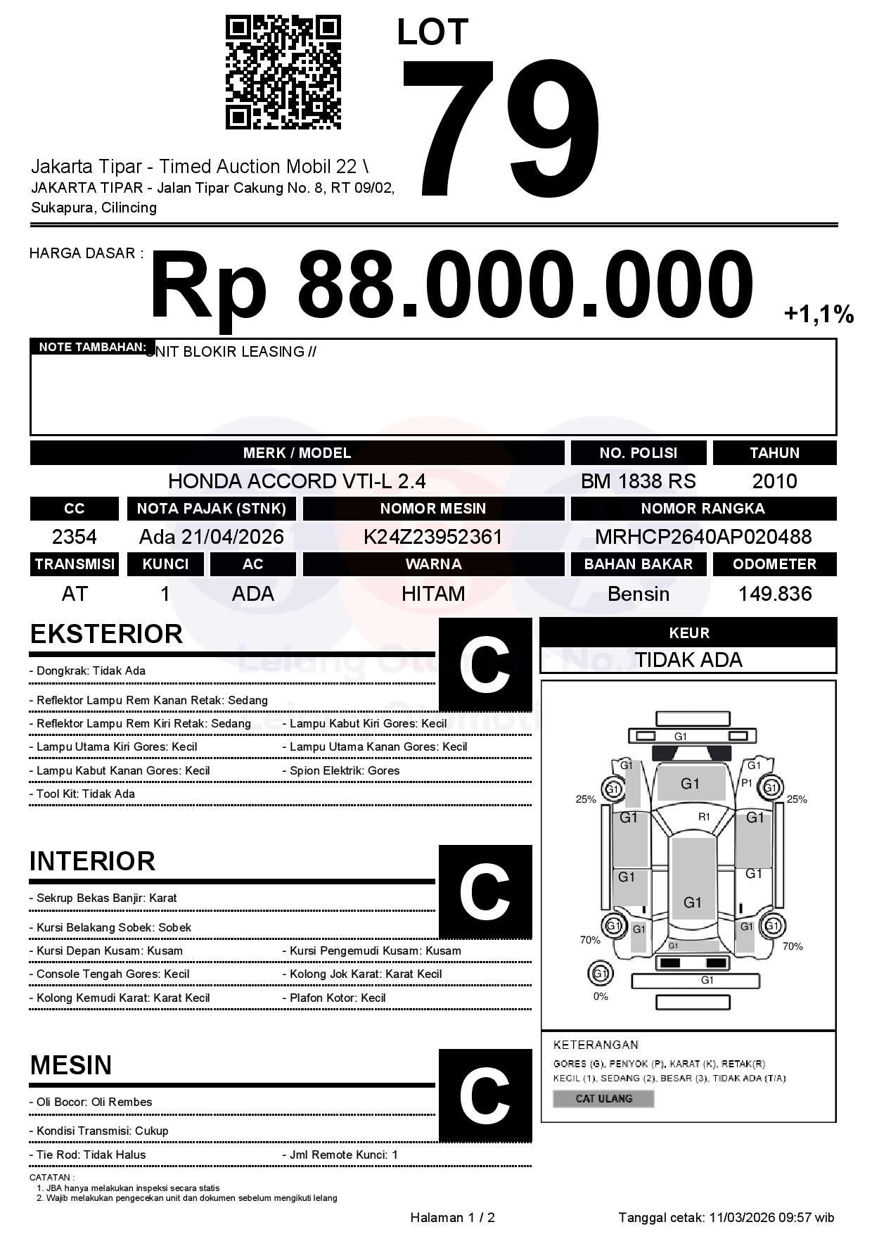 - Kondisi objek lelang dilelang apa adanya, baik kondisi fisik, mesin maupun legalitas kendaraan. Jika terdapat kekurangan/cacat baik yang terlihat maupun yang tidak terlihat, maka semua akan menjadi tanggung jawab/risiko Pemenang Lelang. Oleh karena itu, Pemenang Lelang melepaskan segala hak untuk menuntut dan/atau meminta ganti rugi atas hal tersebut kepada JBA.