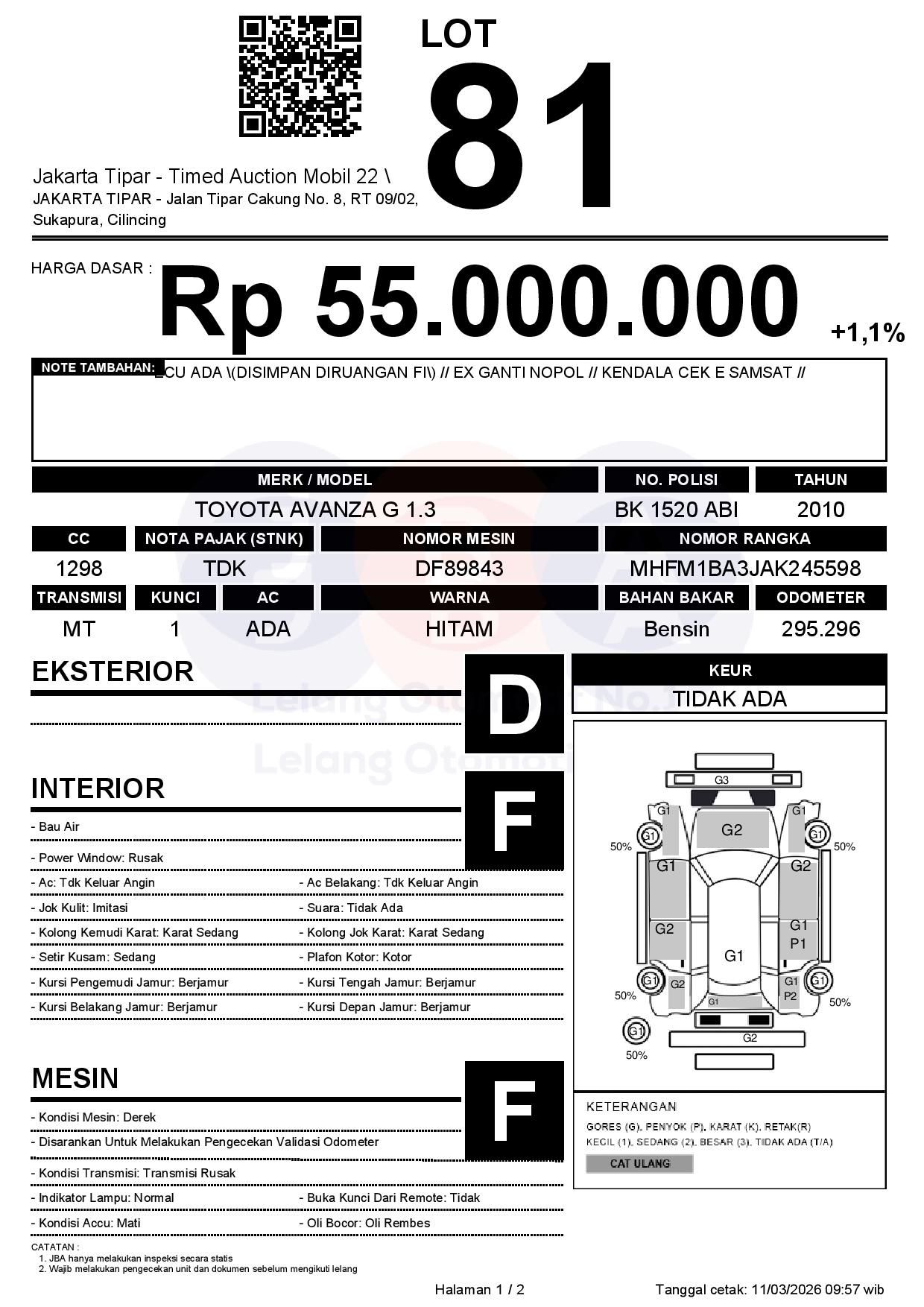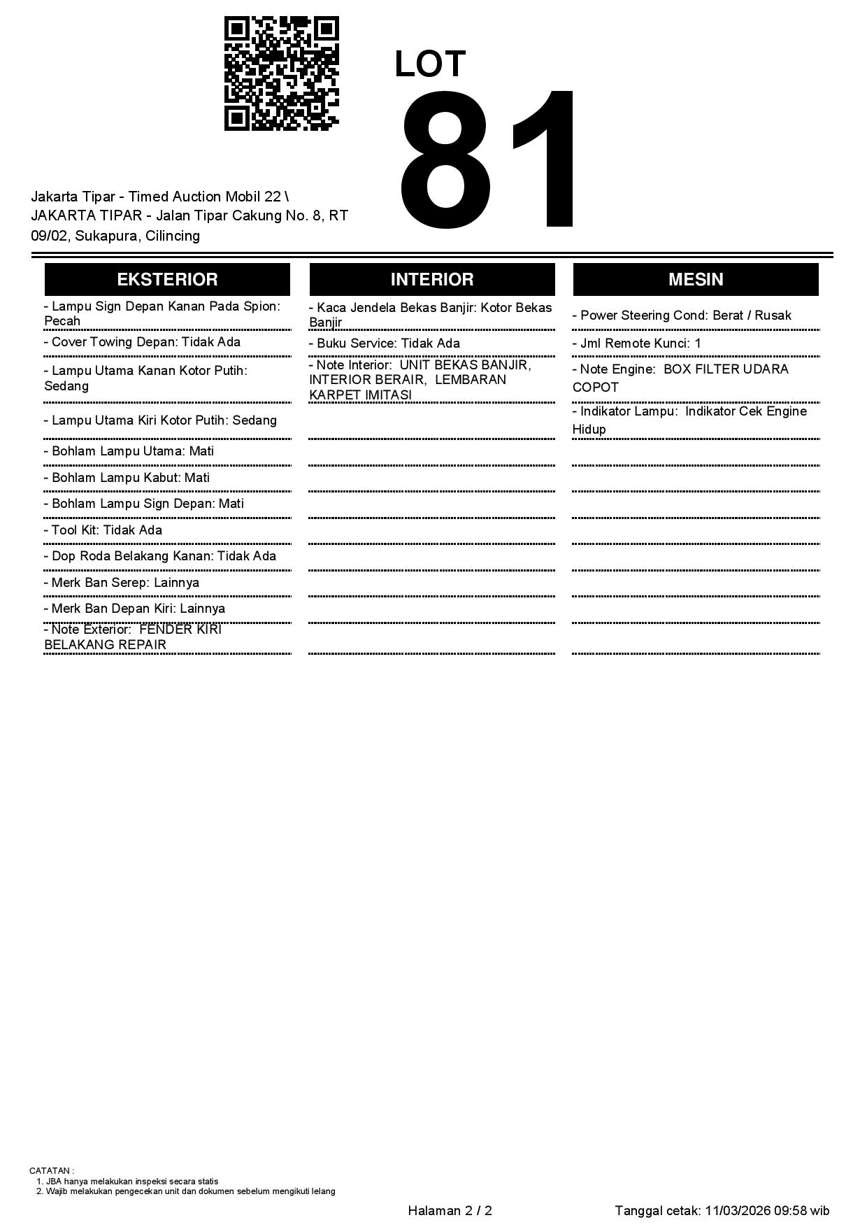 - Kondisi objek lelang dilelang apa adanya, baik kondisi fisik, mesin maupun legalitas kendaraan. Jika terdapat kekurangan/cacat baik yang terlihat maupun yang tidak terlihat, maka semua akan menjadi tanggung jawab/risiko Pemenang Lelang. Oleh karena itu, Pemenang Lelang melepaskan segala hak untuk menuntut dan/atau meminta ganti rugi atas hal tersebut kepada JBA.