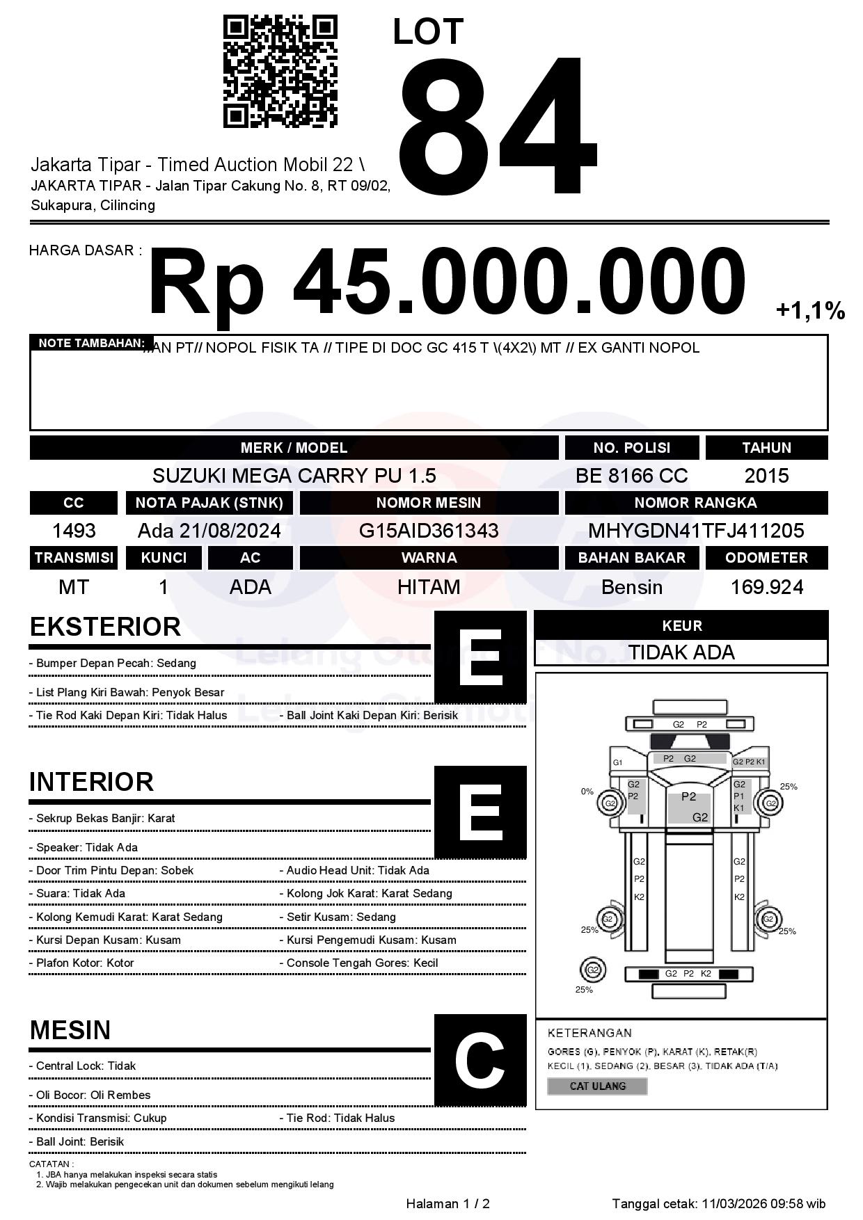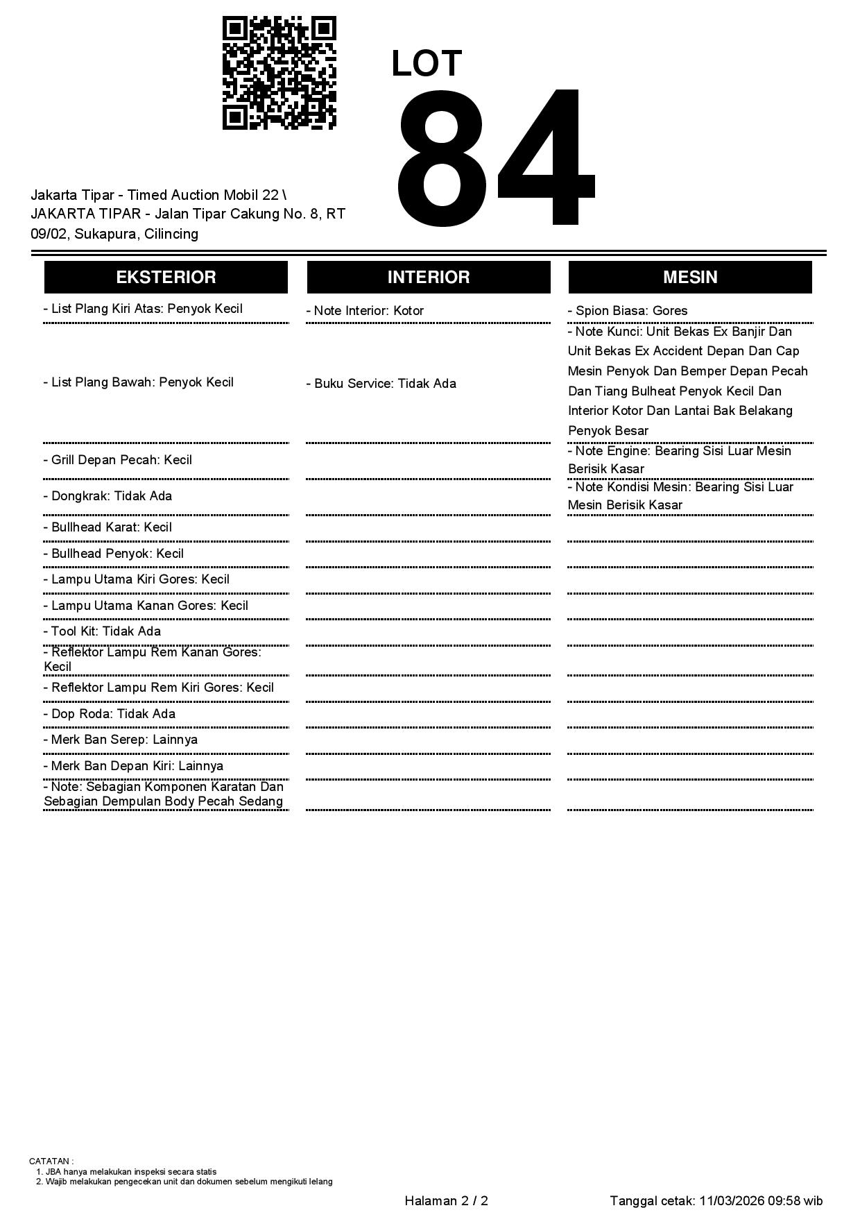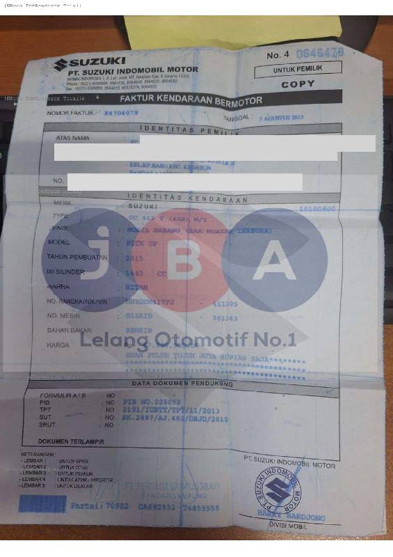 - Kondisi objek lelang dilelang apa adanya, baik kondisi fisik, mesin maupun legalitas kendaraan. Jika terdapat kekurangan/cacat baik yang terlihat maupun yang tidak terlihat, maka semua akan menjadi tanggung jawab/risiko Pemenang Lelang. Oleh karena itu, Pemenang Lelang melepaskan segala hak untuk menuntut dan/atau meminta ganti rugi atas hal tersebut kepada JBA.