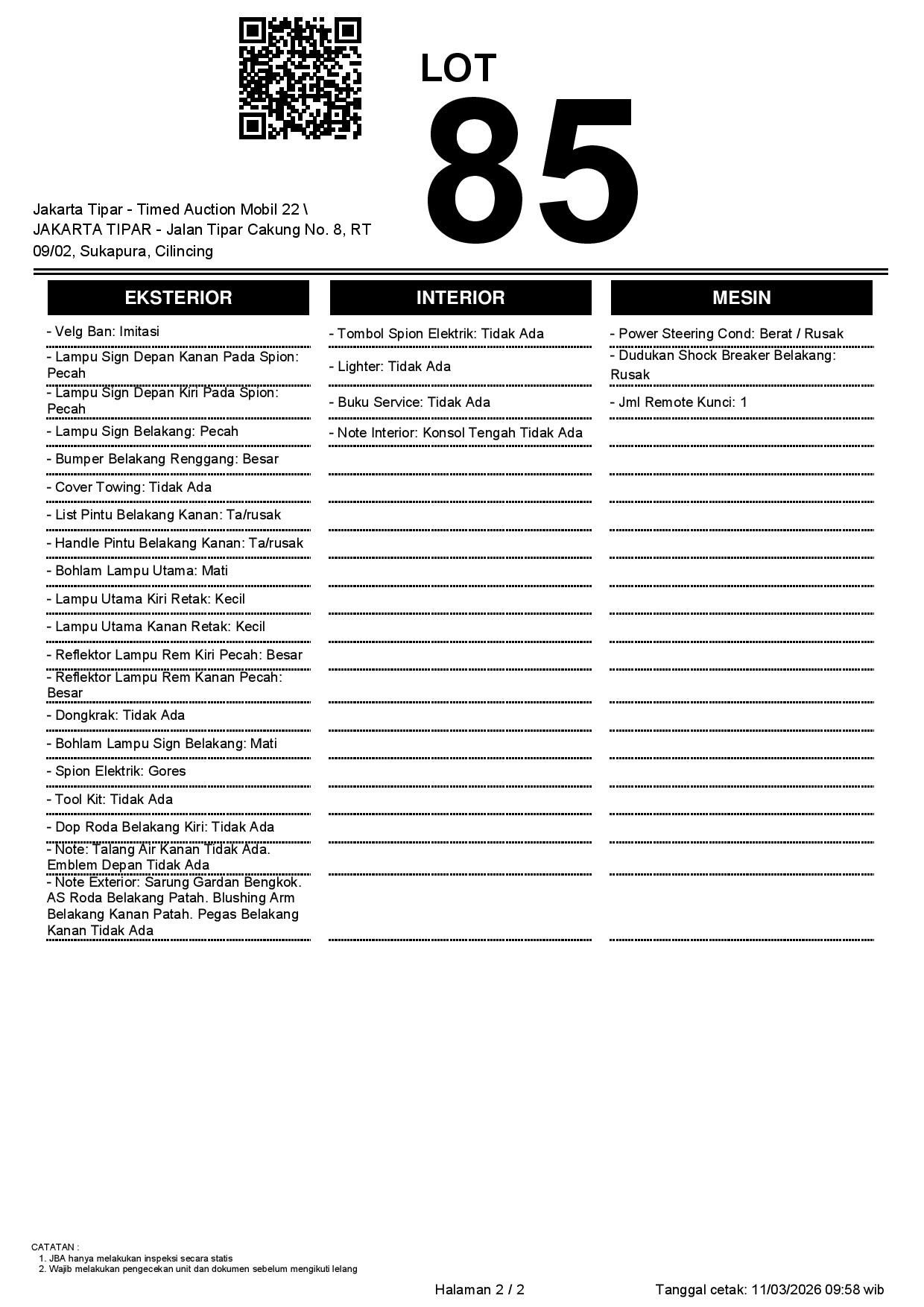 - Kondisi objek lelang dilelang apa adanya, baik kondisi fisik, mesin maupun legalitas kendaraan. Jika terdapat kekurangan/cacat baik yang terlihat maupun yang tidak terlihat, maka semua akan menjadi tanggung jawab/risiko Pemenang Lelang. Oleh karena itu, Pemenang Lelang melepaskan segala hak untuk menuntut dan/atau meminta ganti rugi atas hal tersebut kepada JBA.